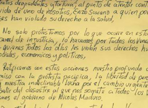 A través de la cuenta en Twitter el coordinador nacional de Voluntad Popular,  se informó que los políticos presos, Leopoldo López, Enzo Scarano, Salvatore Lucchesse y Daniel Ceballos, desde el centro reclusión de Ramo Verde, se declararon en protesta permanente por causas precisas