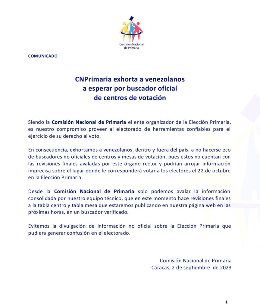 La Comisión Nacional de Primaria exhortó a los venezolanos a no hacerse eco de buscadores no oficiales de centros y mesas de votación, pues estos no cuentan con revisiones finales avaladas por el órgano rector