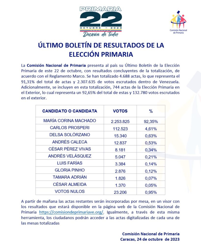 María Corina Machado ganó con más de 2,3 millones de votos la elección primaria organizada el 22 de octubre por la Comisión Nacional de Primaria (CNP), una entidad civil que ahora está bajo amenaza penal del régimen chavista de Nicolás Maduro.