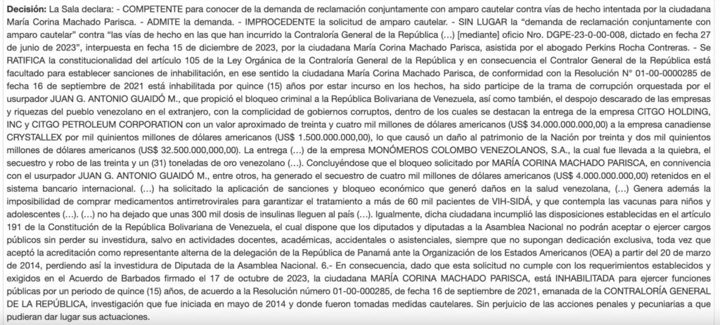 A través de la sentencia 00005 y el expediente 2023-0461, el TSJ declaró improcedente la solicitud de amparo cautelar que Machado entregó al TSJ en diciembre pasado. Algunos de los motivos para inhabilitarla que consideró el TSJ es su supuesta vinculación «en la trama de corrupción orquestada por el usurpador Juan Guaidó (…), que propició el bloqueo criminal a la República Bolivariana de Venezuela, así como también, el despojo descarado de las empresas y riquezas del pueblo venezolano en el extranjero».