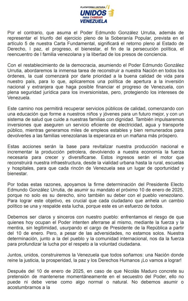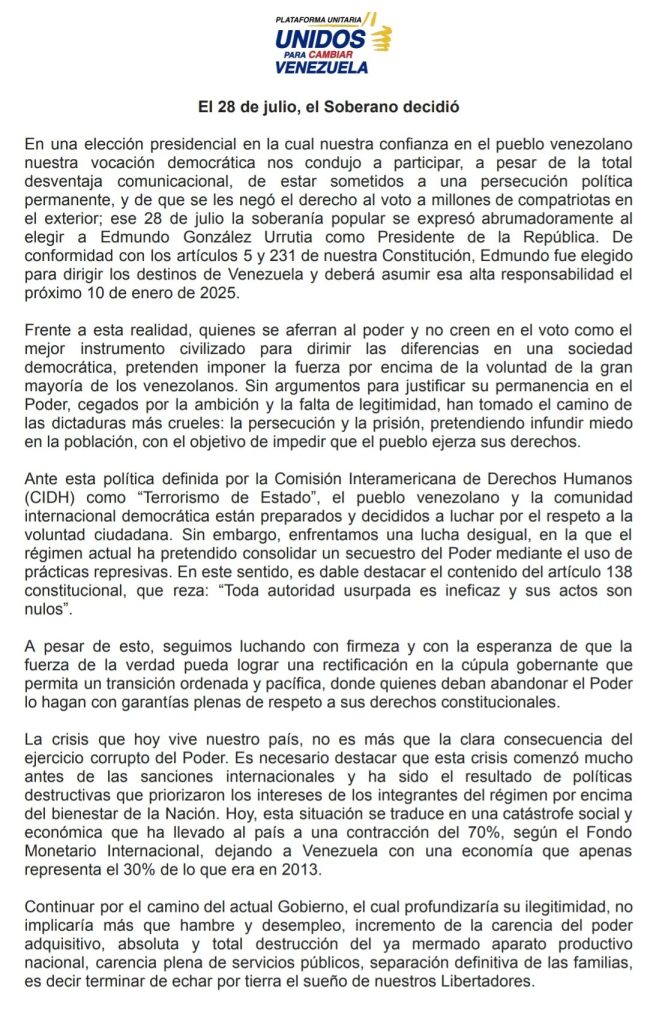 En un largo texto, la Unidad Democrática reitera la legitimidad de González Urrutia como presidente electo, expresan sus esperanzas sobre que la «cúpula gobernante» admita los verdaderos resultados electorales y permita una transición pacífica, condena el «secuestro del poder» actual mediante «prácticas represivas» y advierten que, en caso de continuar esa situación, tanto «el pueblo venezolano» como la comunidad internacional estarán dispuestos a luchar con firmeza.