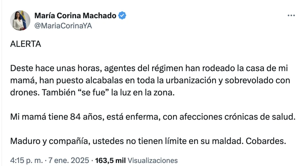 La líder de la oposición, María Corina Machado, denunció más tarde que la casa de su madre lleva horas rodeada por funcionarios del gobierno de Nicolás Maduro.