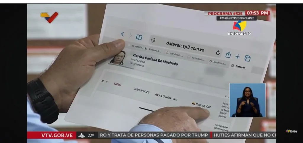 Mostrando una presunta foto de Corina Parisca, Cabello dijo: «Esta señora que está aquí es la mamá de María Corina Machado, parte de esta negociación, aquí está su pasaporte, para que ustedes vean que ahí entra todo el mundo, en esa negociación. Aquí está la señora en el aeropuerto y su orden de abordaje».