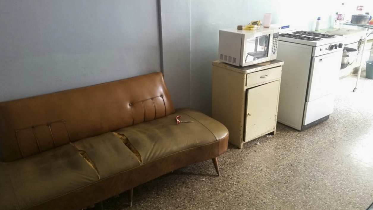La camarera muestra la lavandería, donde no funciona la lavadora, y deben asear a mano. En lo que una vez fue el comedor, la cocina no prende y las paredes manchadas y marcos de puertas oxidadas hablan por sí solas del abandono de las instalaciones. La única ambulancia está estacionada desde hace un par de años por falta de repuestos.