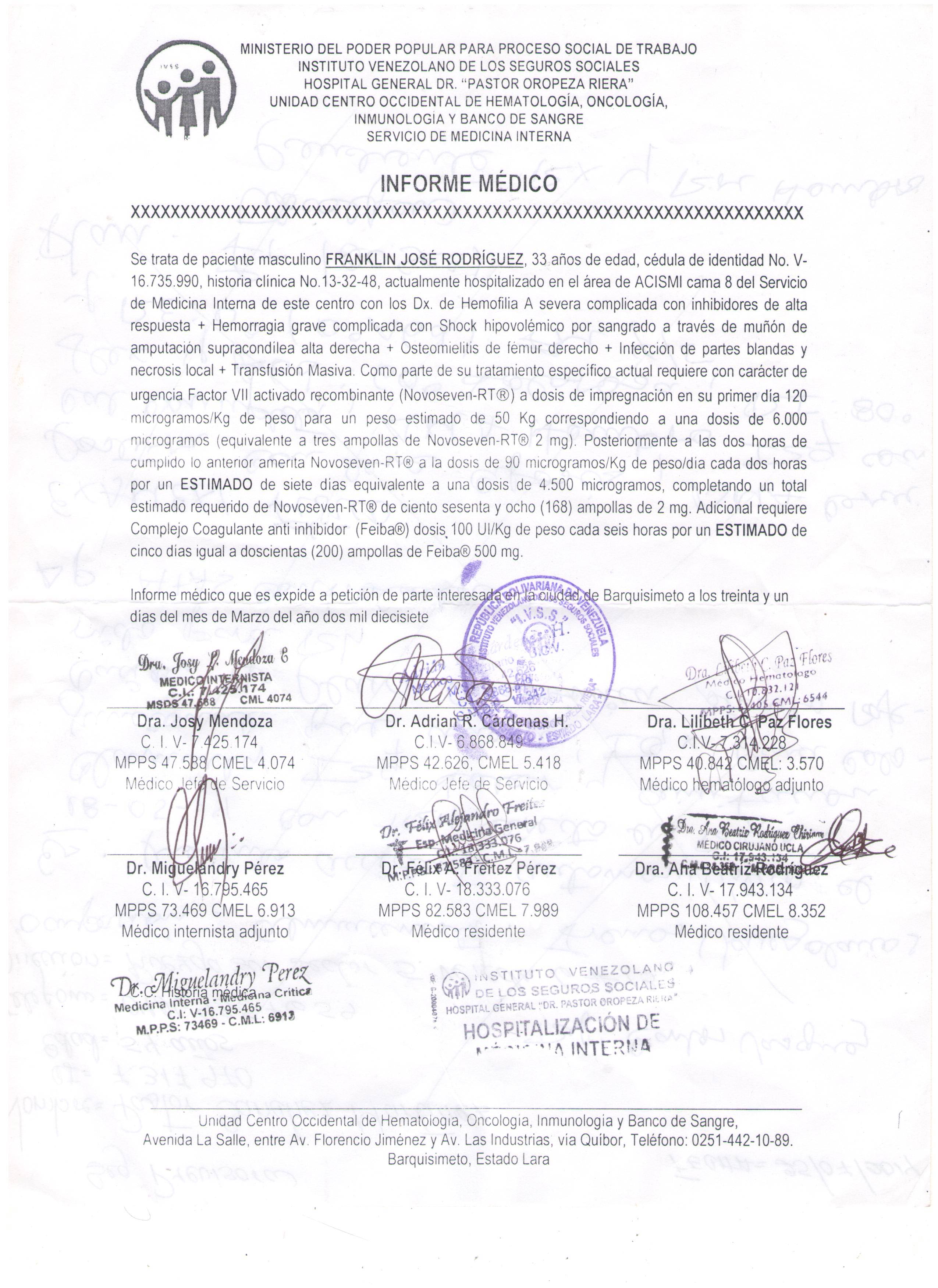 “El lunes 31 de marzo fue que me dieron el bendito informe en el hospital. Cuando ya no había nada que hacer, cuando ya no quedaba factor en ningún lado en el país. Llamamos a medio mundo. Y mientras tanto Franklin se terminó de deteriorar. Yo no pedía el informe para mandarlo al gobierno de Estados Unidos, sino al mismo Seguro Social o al Banco de Sangre, en Caracas”, sollozó Giménez.