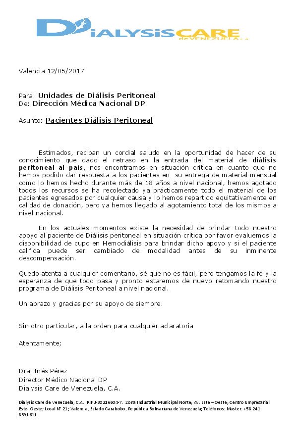 Esa posibilidad ya no existe en el país. La empresa Dialysis Care de Venezuela envió el 12 de mayo un comunicado que advierte la falta de material para la realización de diálisis peritoneal en toda Venezuela.