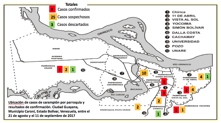 Datos recabados por la Sociedad de Médicos Internos y Residentes del Hospital Ruiz y Páez, en el estado Bolívar, en las últimas tres semanas revelan que se han registrado 8 casos de sarampión confirmados por laboratorio, 25 sospechas de infección con signos clínicos, y 3 casos descartados.