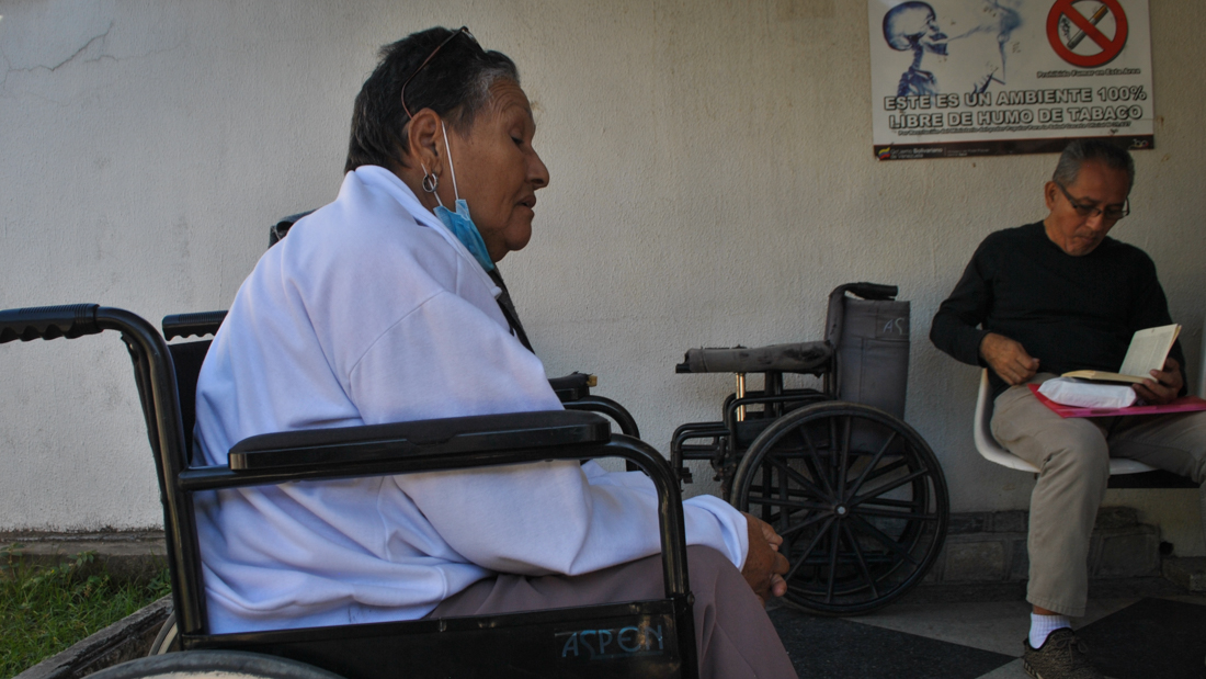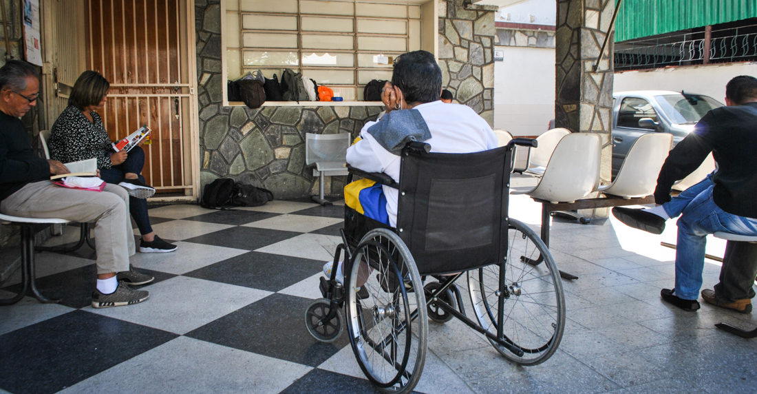 Elina Rojas es una de estas pacientes. Lleva dos años dializándose. Tiene 65 años. Es la primera vez en todo ese tiempo que no recibe tratamiento y desde su silla de ruedas espera que llegue los insumos que faltan, que son únicamente los filtros. Vive en Guatire (a las afueras de Caracas) y fue Delgado quien la llevó hasta la clínica, porque ambos residen en esa zona.