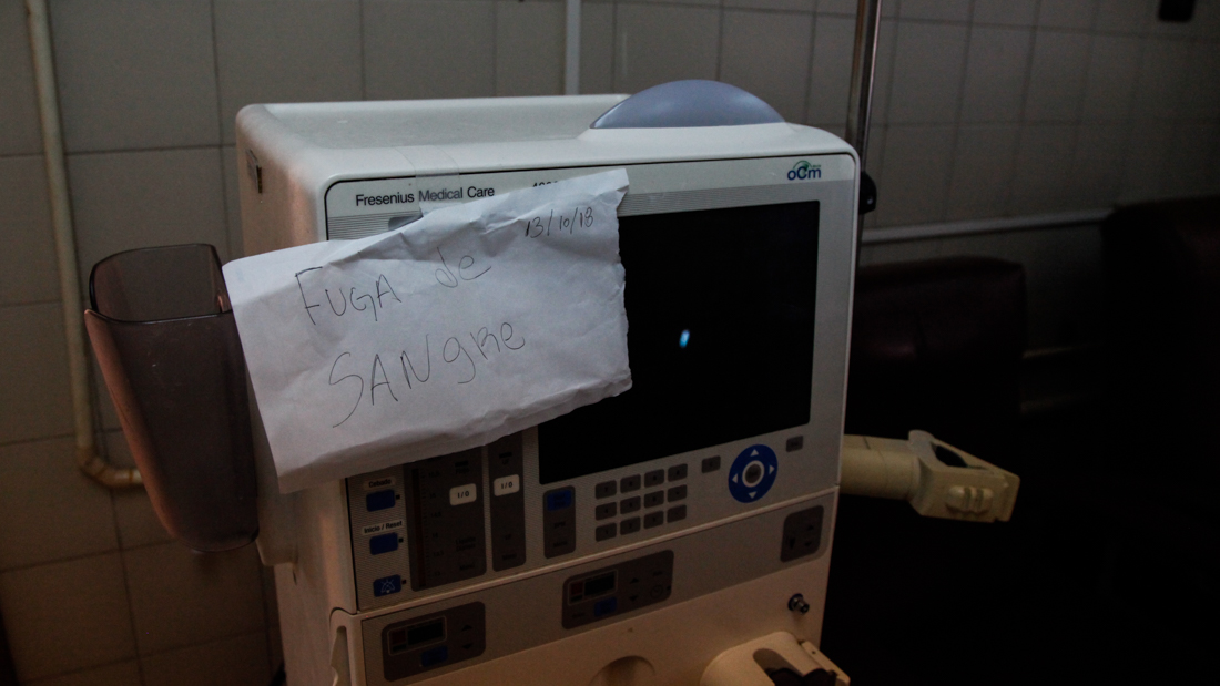 Las enfermeras se quejan de no recibir salarios, el administrador de no tener solvencia administrativa y en medio de ese meollo quedan los pacientes desesperados por su dosis de cuatro -aunque solo les dan tres- horas de diálisis. En mayo de este año, los dolientes se quejaban de falta de insumos para realizar su tratamiento y el Instituto Venezolano de Seguros Sociales tenía 1.000 máquinas de diálisis dañadas en todo el país, y para febrero, la Coalición de Organizaciones por el Derecho a la Salud y la Vida (Codevida) manejaba una cifra de 16 mil afectados por falta de diálisis a nivel nacional.