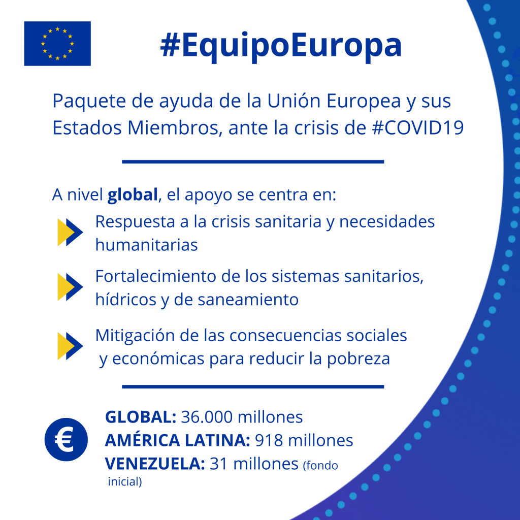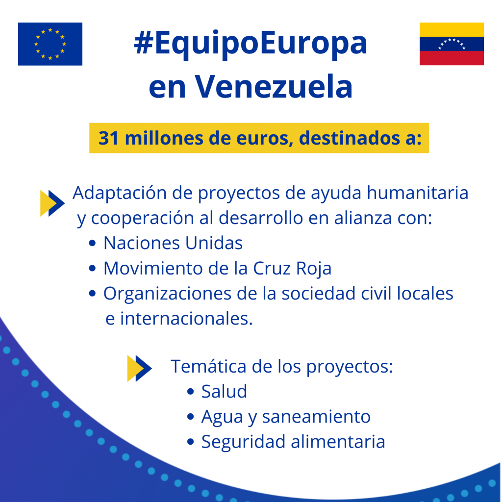 El programa de cooperación #EquipoEuropa de la Unión Europea para luchar contra la pandemia del coronavirus y la covid-19 incluye proyectos que se llevan a cabo en alianza con Naciones Unidas, el movimiento de la Cruz Roja y organizaciones de la sociedad civil locales e internacionales en Venezuela