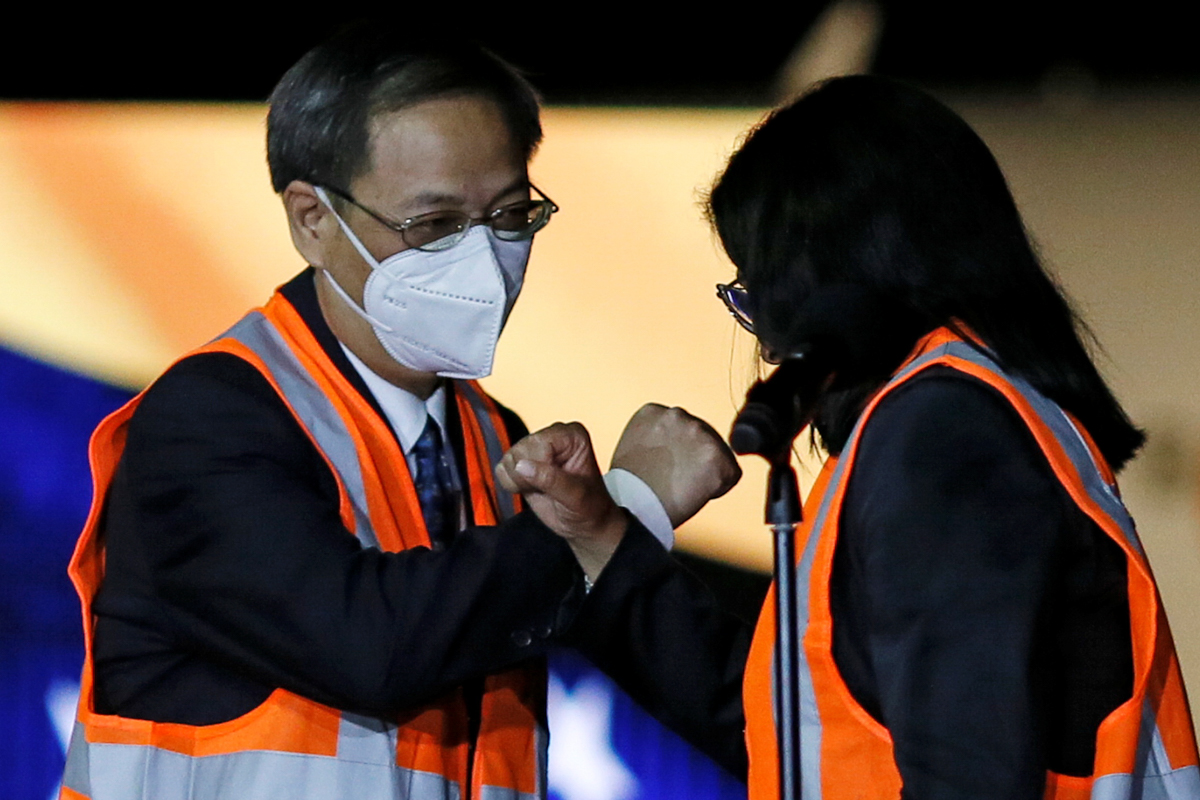 Delcy Rodríguez y el embajador de China en Venezuela, Li Baorong, al recibir las vacunas. Foto Manaure Quintero / Reuters