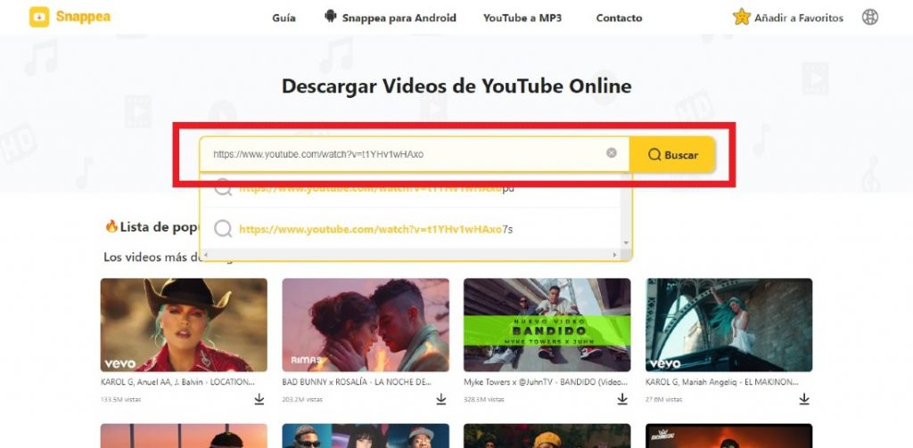 Paso 2. Ahora debes ingresar en la web oficial de Snappea y pegar el link en la barra de búsqueda que aparece en medio de la pantalla. Una vez pegada le das a “Buscar”.