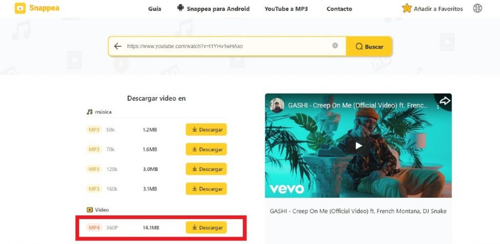 Paso 3. Snappea procesará el video y te da la opción de descargar Mp3 o Mp4, si quieres solo el audio entonces debes seleccionar Mp3, pero si quieres solo el video entonces debes elegir el de “Mp4” y le das a “Descargar”.