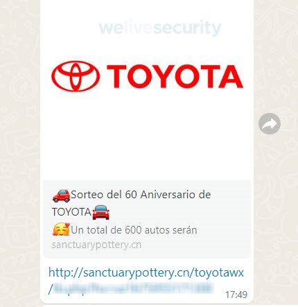 El engaño viaja en mensajes de Facebook y WhatsApp que hacen creer que Toyota está sorteando un automóvil por el supuesto aniversario número 60 de la reconocida firma japonesa, advierte la compañía ESET, de detección proactiva de amenazas en el mundo digital.