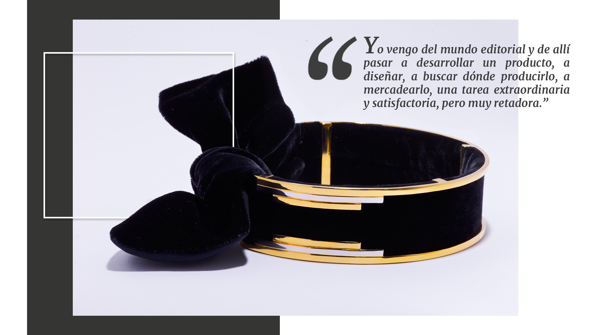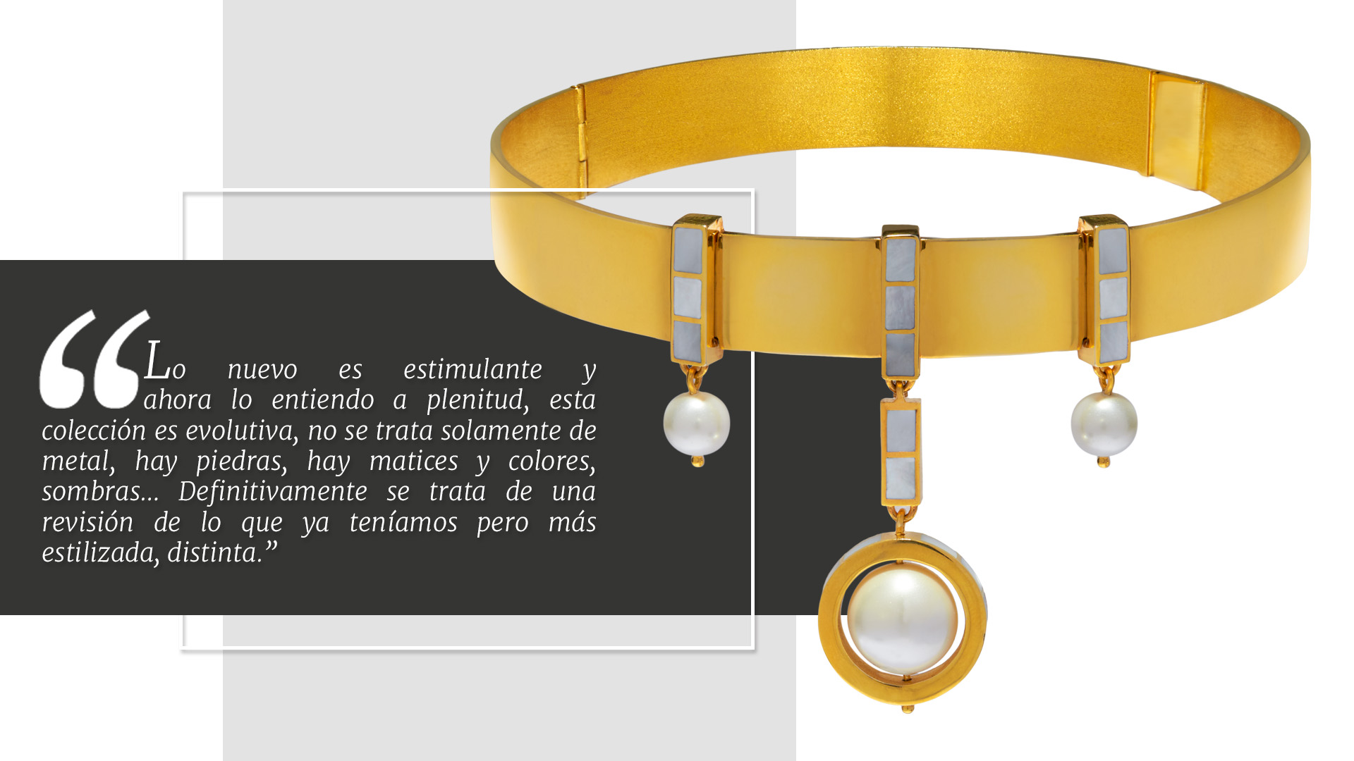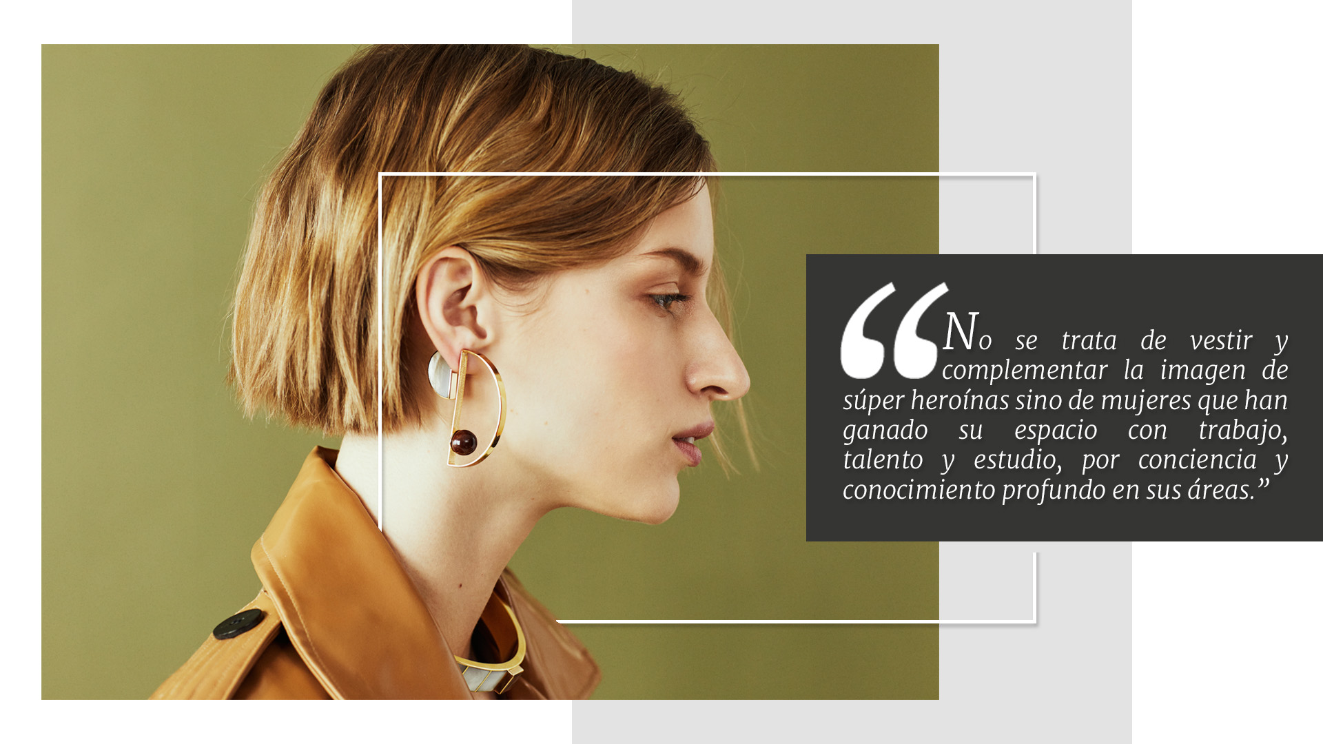 “Mi marca está relacionada con mujeres ponderosas, y lo afirmo en el nuevo sentido del término, no se trata de vestir y complementar la imagen de súper heroínas sino de mujeres que han ganado su espacio con trabajo, talento y estudio, por conciencia y conocimiento profundo en sus áreas. Son joyas para mujeres reales que se visten para comunicar un mensaje, para ser efectivas y transformarse en agentes de cambios fundamentales. Mis piezas siempre han tenido relación con el carácter y la personalidad de quien las luce, y lo digo porque son accesorios con peso, con un tamaño no convencional, por la energía que transmiten.”