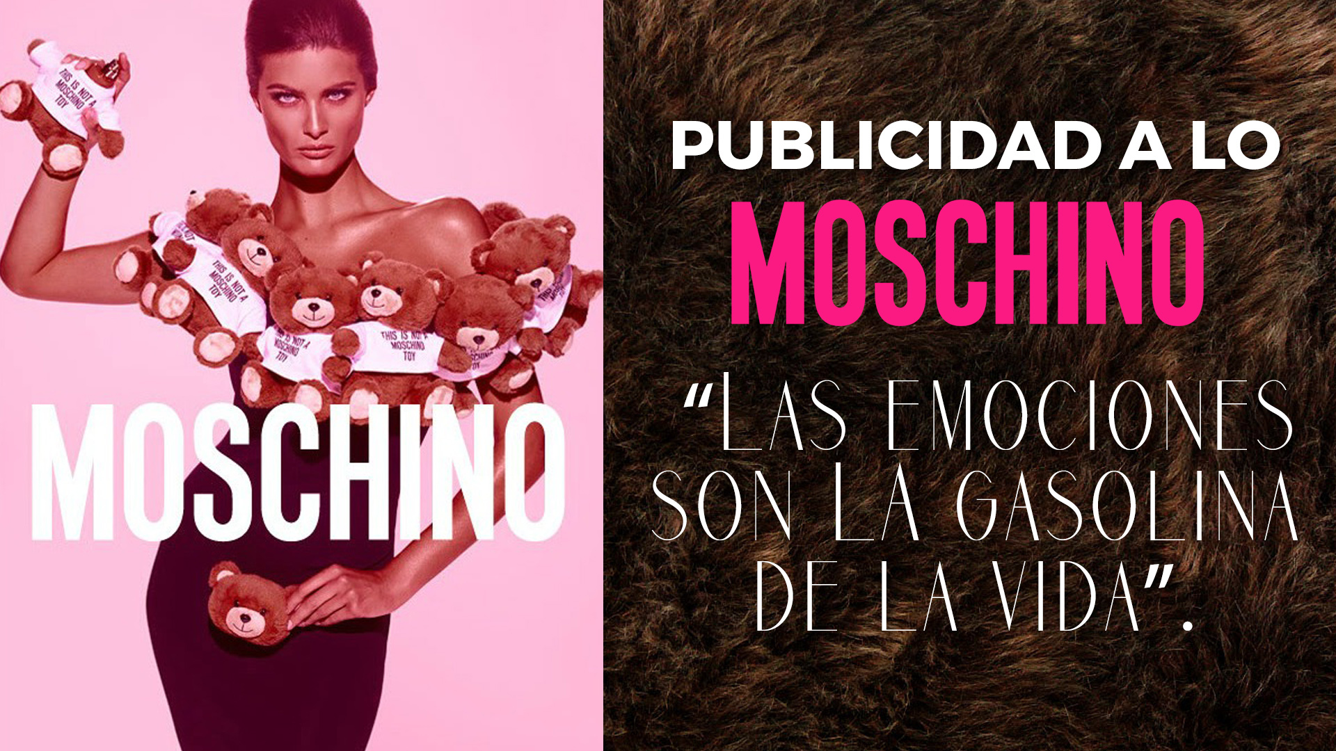 Moschino hacia publicidad de la publicidad, esa fue la manera que decidió para difundir y comunicar su propia imagen. Sus extraordinarios montajes y reconocibles collages eran una sorpresa en el mundo de la comunicación y justamente por eso resultaban transgresores y hasta escandalosos, como su moda. Pero el objetivo se cumplió, podrán haber personas que no recuerden sus vestidos pero seguramente recordarán su publicidad.