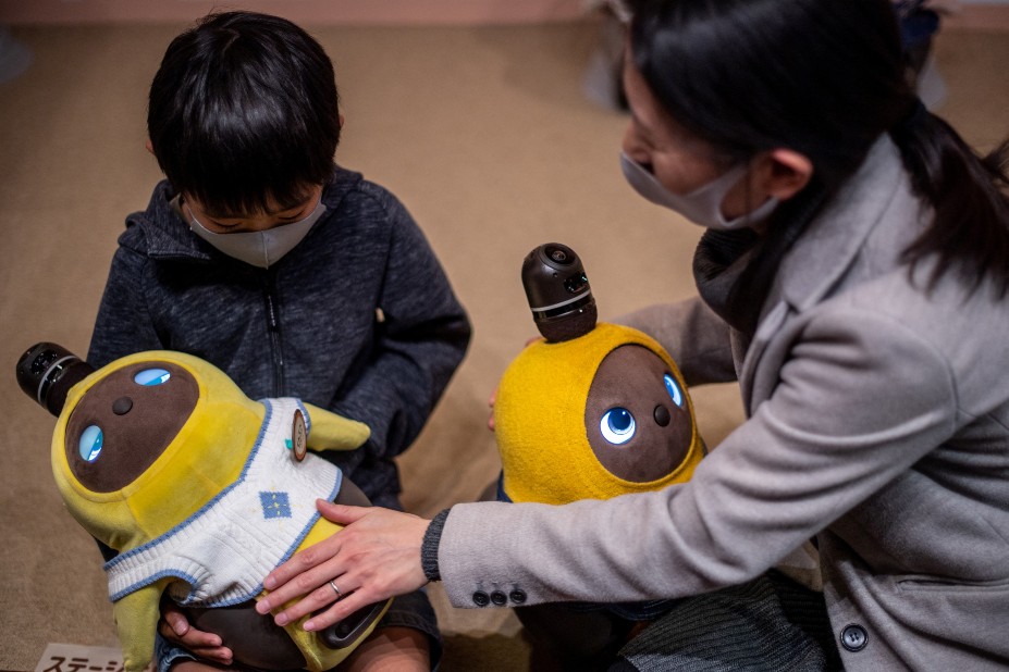 En un café de de Kawasaki, clientes interactúan con robots Lovot. Foto: Philip FONG/AFP