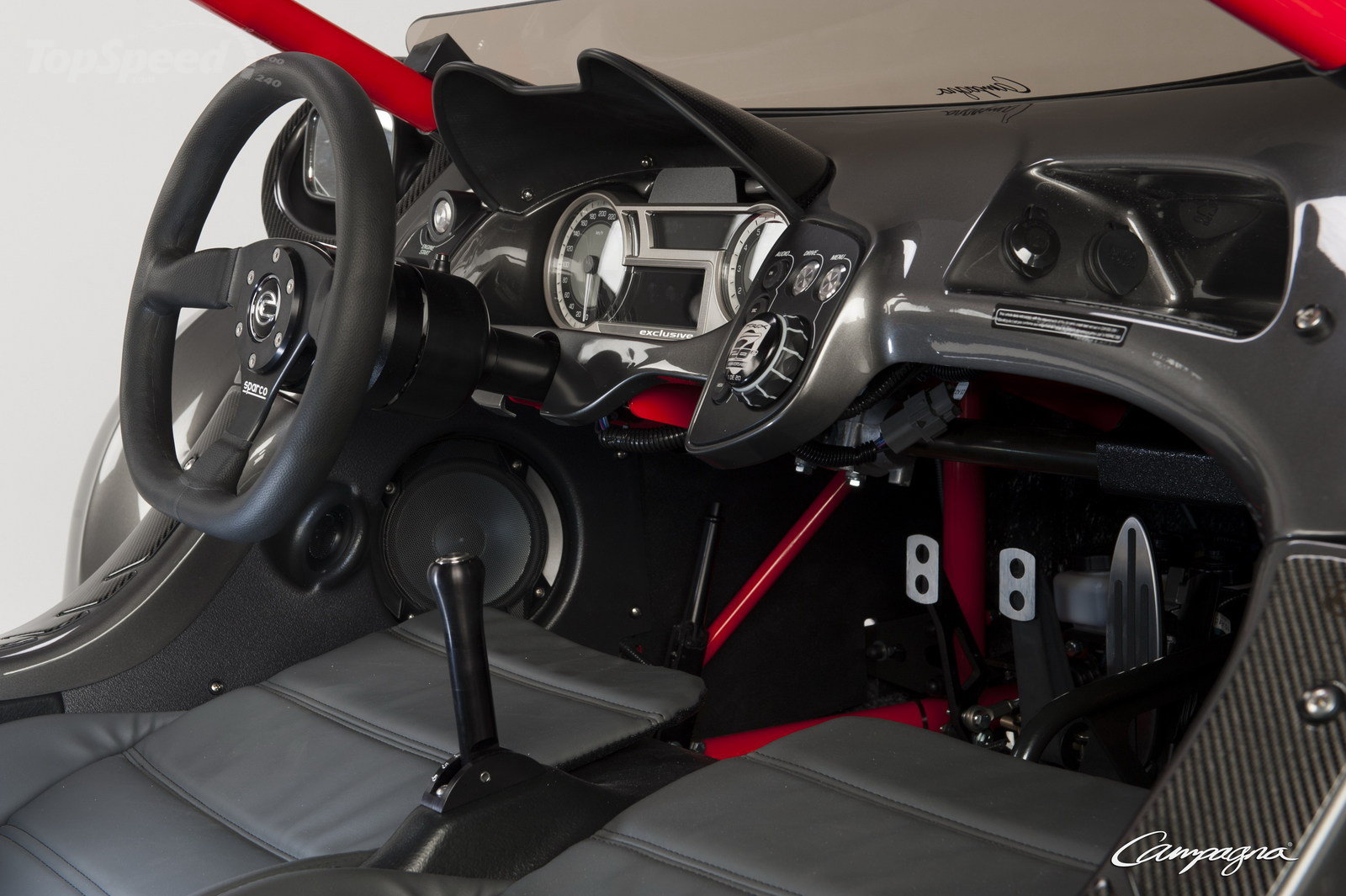Los ocupantes disfrutan de un nivel de confort que ignoran los motorizados: sonido Alpine de 180 vatios de potencia, conectividad USB, iPod y Bluetooth. Además, el manubrio de la moto es sustituido por un timón desmontable y la transmisión se maneja desde una palanca en la consola central y pedales para el embrague.