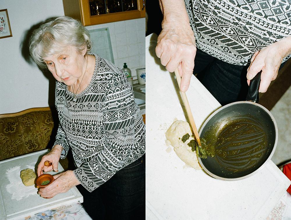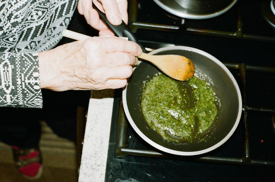 La abuela separa los ingredientes para la masa y la marihuana, coloca todo mezclado para la masa en un envase y lo envuelve con papel contact. En un sartén coloca una cucharadita de mantequilla y la marihuana. Espera a que se cocine un poco, y le resulta algo que parece salsa pesto.