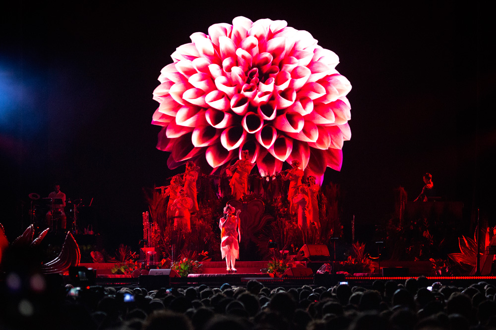 La genialidad islandesa que se ha mantenido en la vanguardia por 40 años apareció en tarima con un despliegue audiovisual alucinante, acompañada por una agrupación de siete flautistas dulces desplegadas en lo que se asemeja a un bosque, a un paisaje onírico, a lo que parece una oda a Sueño de una noche de verano. Björk te deja sin palabras ante el despliegue vocal y visual de su presentación: 14 canciones que se concentraron en su mayoría en Utopia, el noveno disco (co-producido por el venezolano Alejandro Ghersi A.K.A Arca) en donde ha volcado y transformado toda su decepción amorosa en arte, sublimación pura y dura.