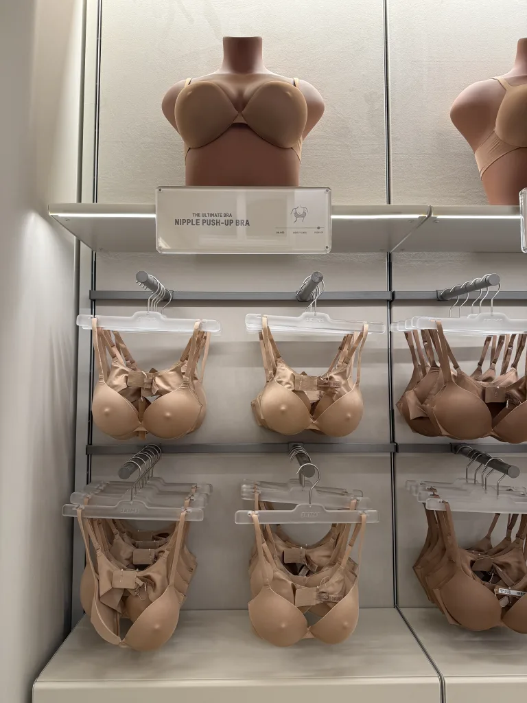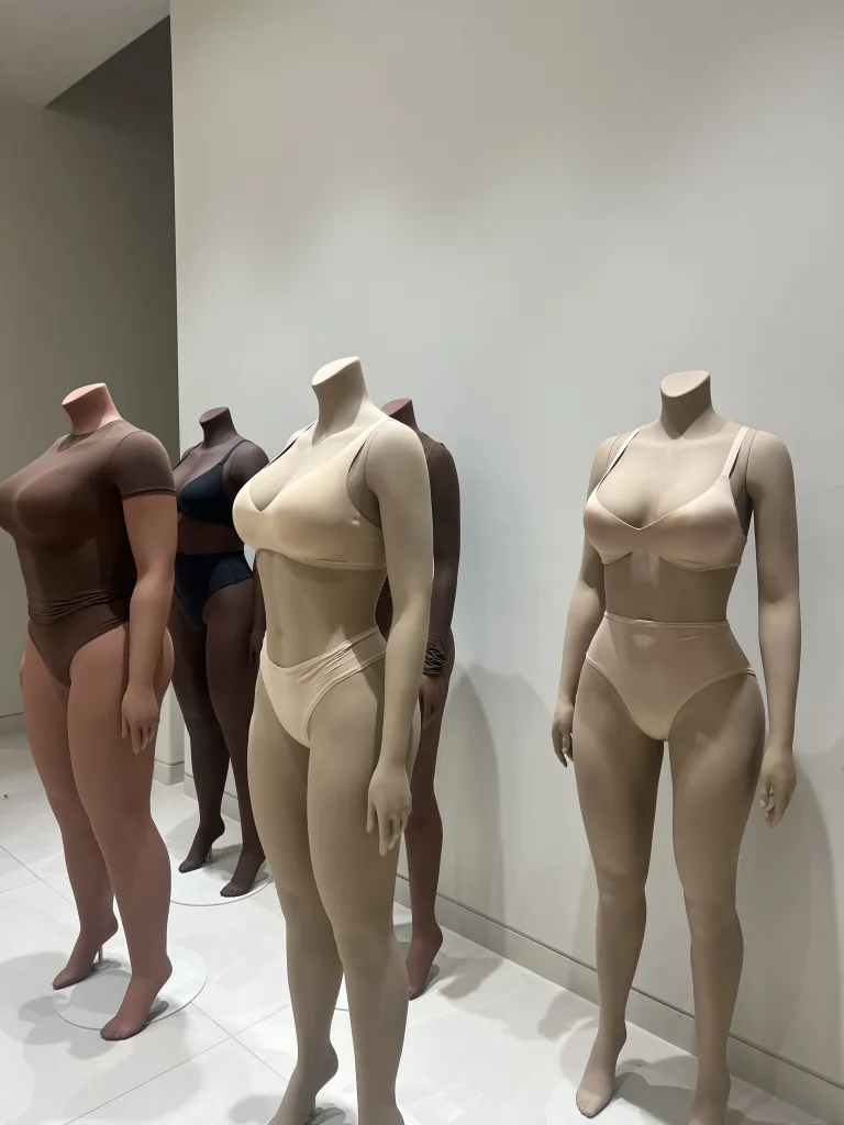 Paredes blancas: el foco son los cuerpos. No lo olviden. Parece un museo, toda la atmósfera es blanca pero está muy claro que en la pared hay obras de arte. Maniquís de todas las tonalidades de piel, desde el más claro al más oscuro. Te da paz, también placer. No sientes que el producto sean las fajas o los sostenes, te están vendiendo otra cosa.