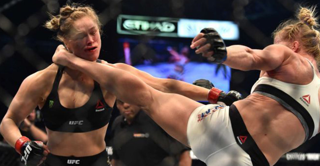 La campeona del título mundial de la UFC Ronda Rousey quedo tendida en el lona luego de que su rival, Holly Holm le propinara una brutal patada en la cara. La violencia de estas chicas del cuadrilátero deja perplejos a los más rudos boxeadores masculinos