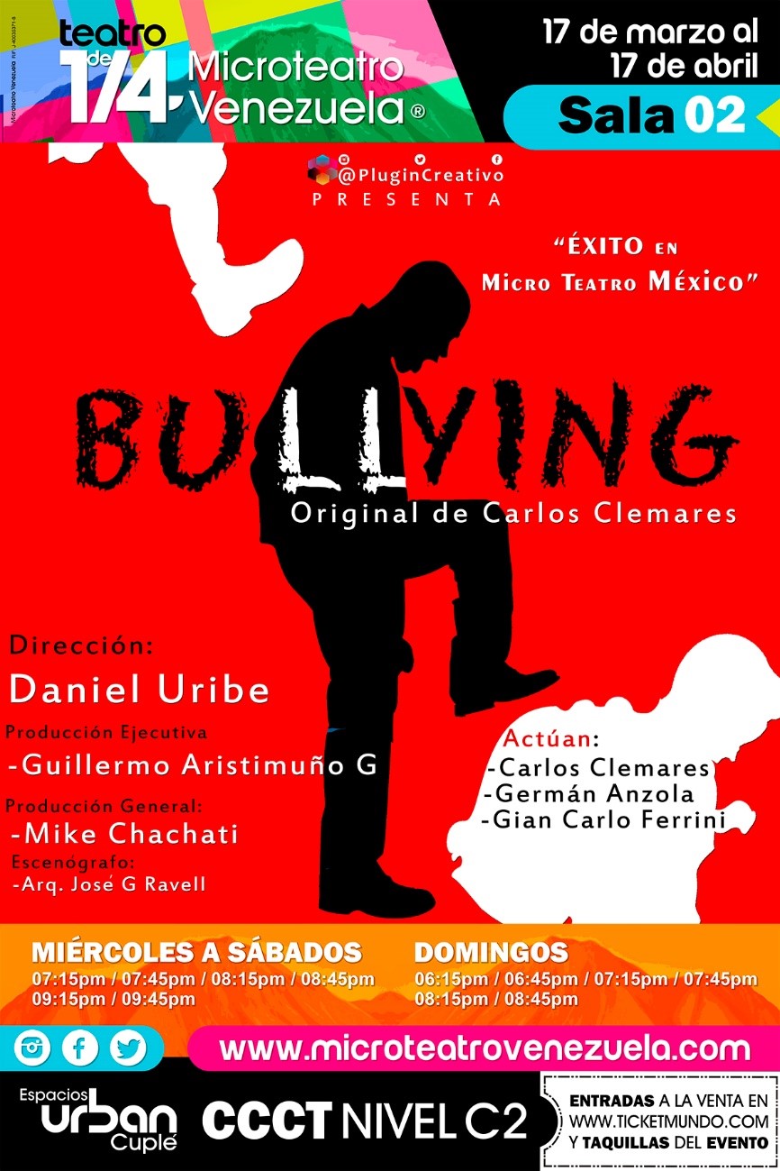 Esta pieza dirigida por uno de los directores jóvenes de la temporada, Jan Vidal, es producida en familia con la compañía Jota Creativa C.A, que integra junto a sus padres Julie Restifo y Javier Vidal. Ramón Santana y Vidal serán los protagonistas de esta sátira crítica que promete. Bullying