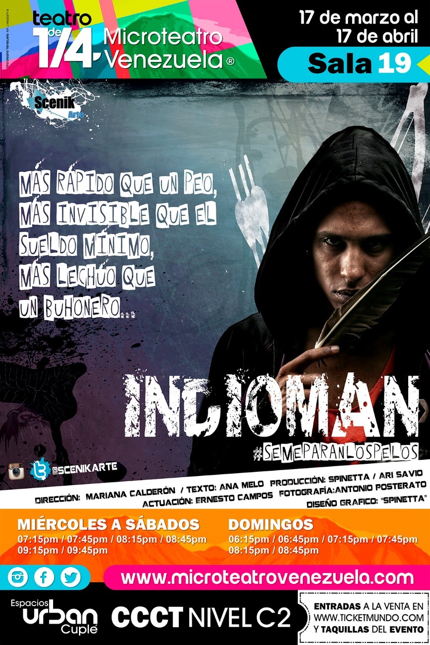Una vez un niño dibujó a Indioman, un súper héroe a lo venezolano “más rápido que un peo, más invisible que sueldo mínimo, más lechúo que un bachaquero”. Él es un temerario que se esconde en el anonimato. De día tiene cholas de plástico, anda pa` arriba y pa` abajo haciéndole los mandados a su mamá, pero de noche es arrecho, es poderoso, invencible, y se conoce todos los barrios de Caracas. A pesar de las risas y las situaciones familiares, no todo es lo que parece, y el destino de Indioman le depara un camino inesperado.