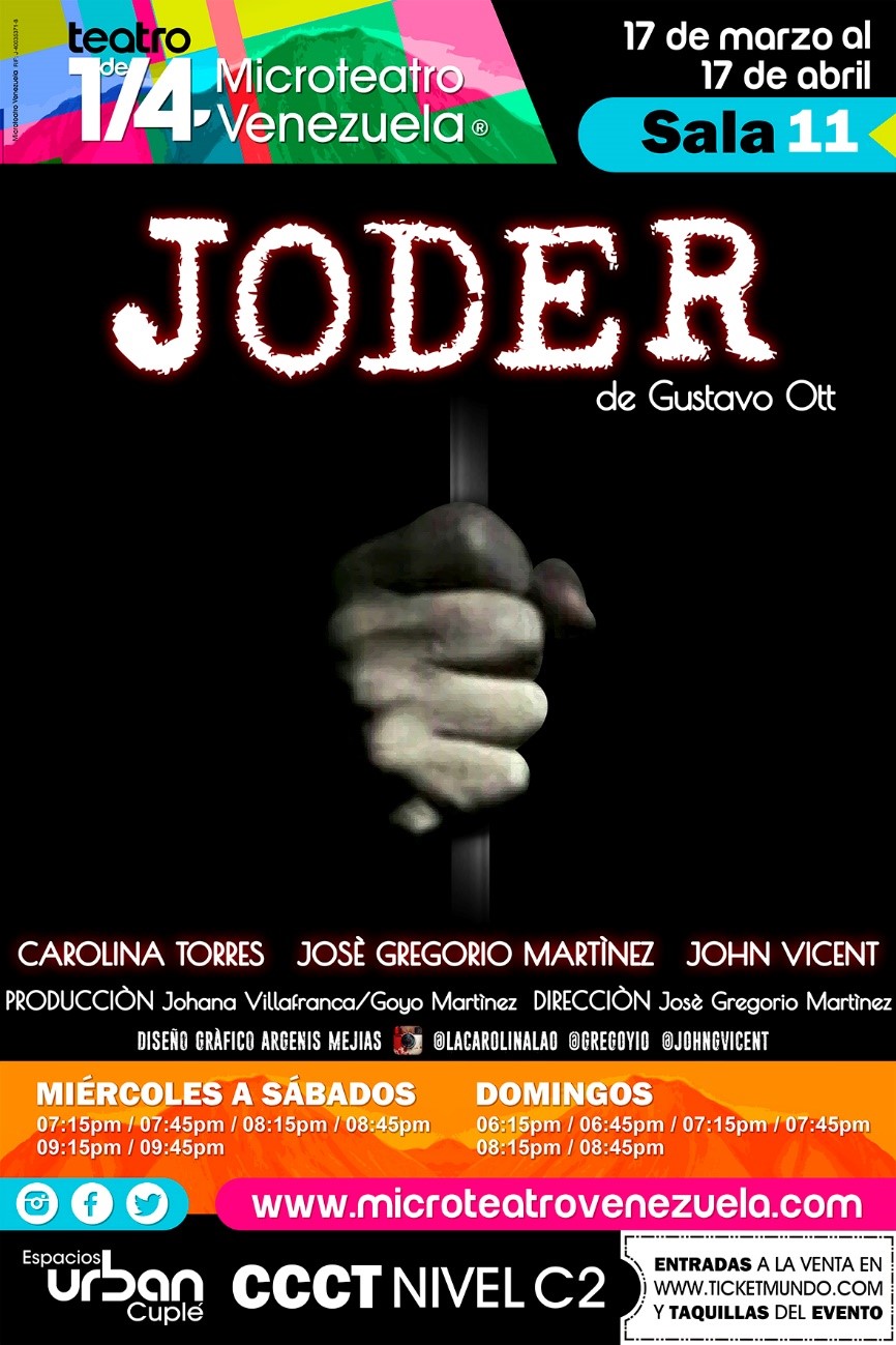 De lo creadores de “Notará que llevo un arma” se presenta «Joder», la última obra del dramaturgo Gustavo Ott. «Joder», según su director, es «teatro reflexivo con humor, pero también con áreas punzantes, macabras e inclusive crueles. Un teatro hecho para gustar, temer y doler». Del maltrato a la infidelidad, del acoso al amor por el país y de ahí al abuso, «Joder» envuelve con esas cadenas que nos arrastran para siempre si no conseguimos el valor de romperlas.