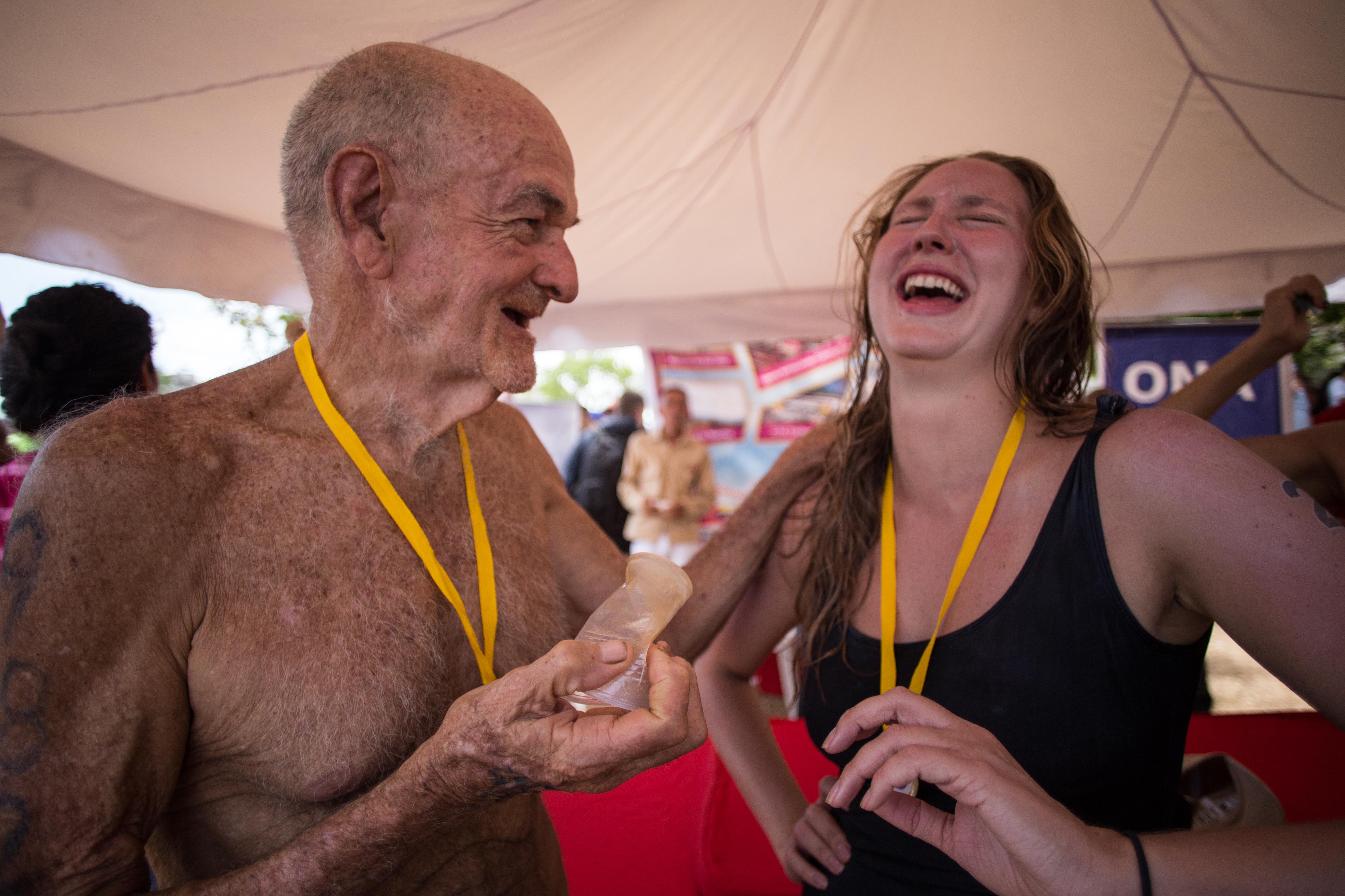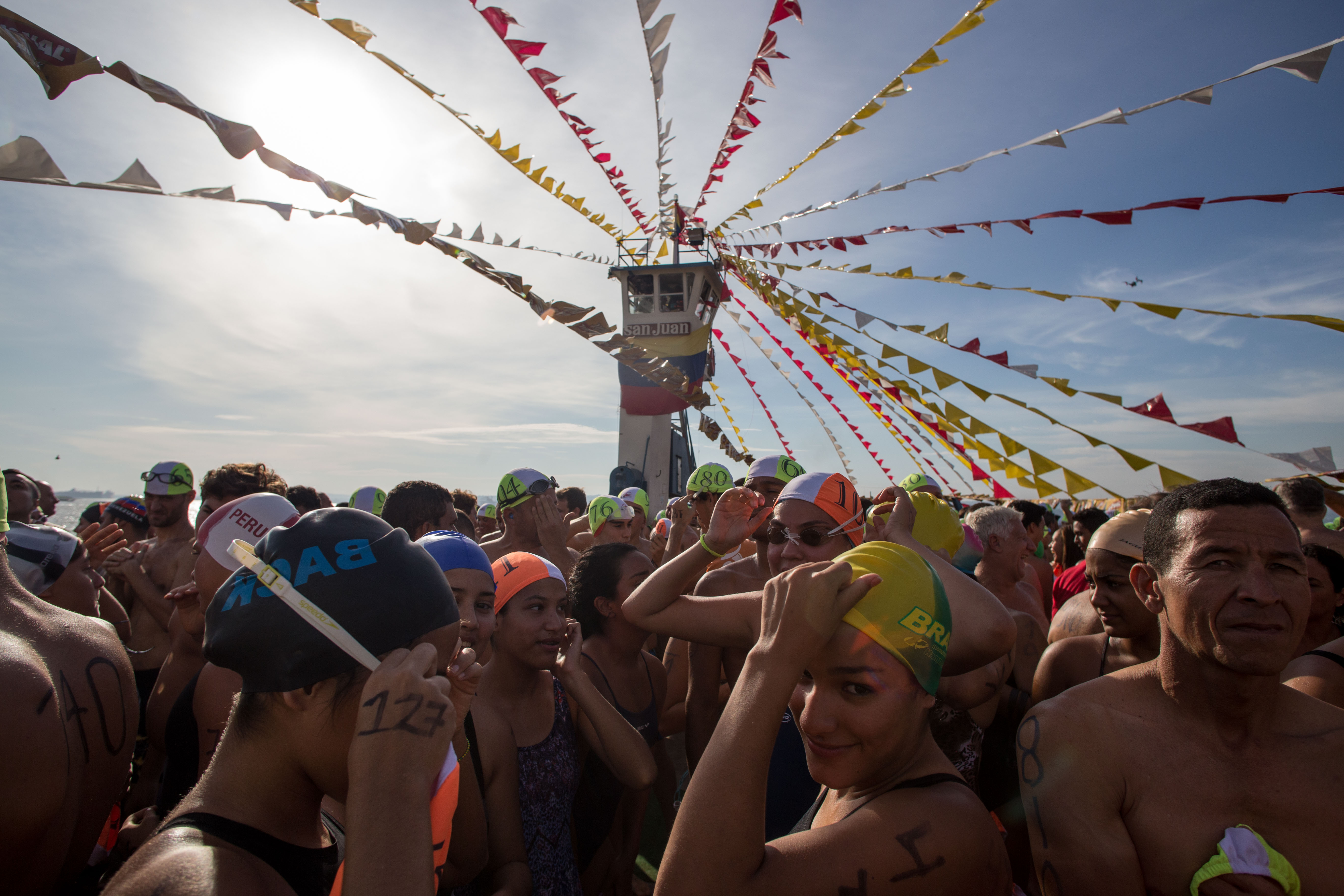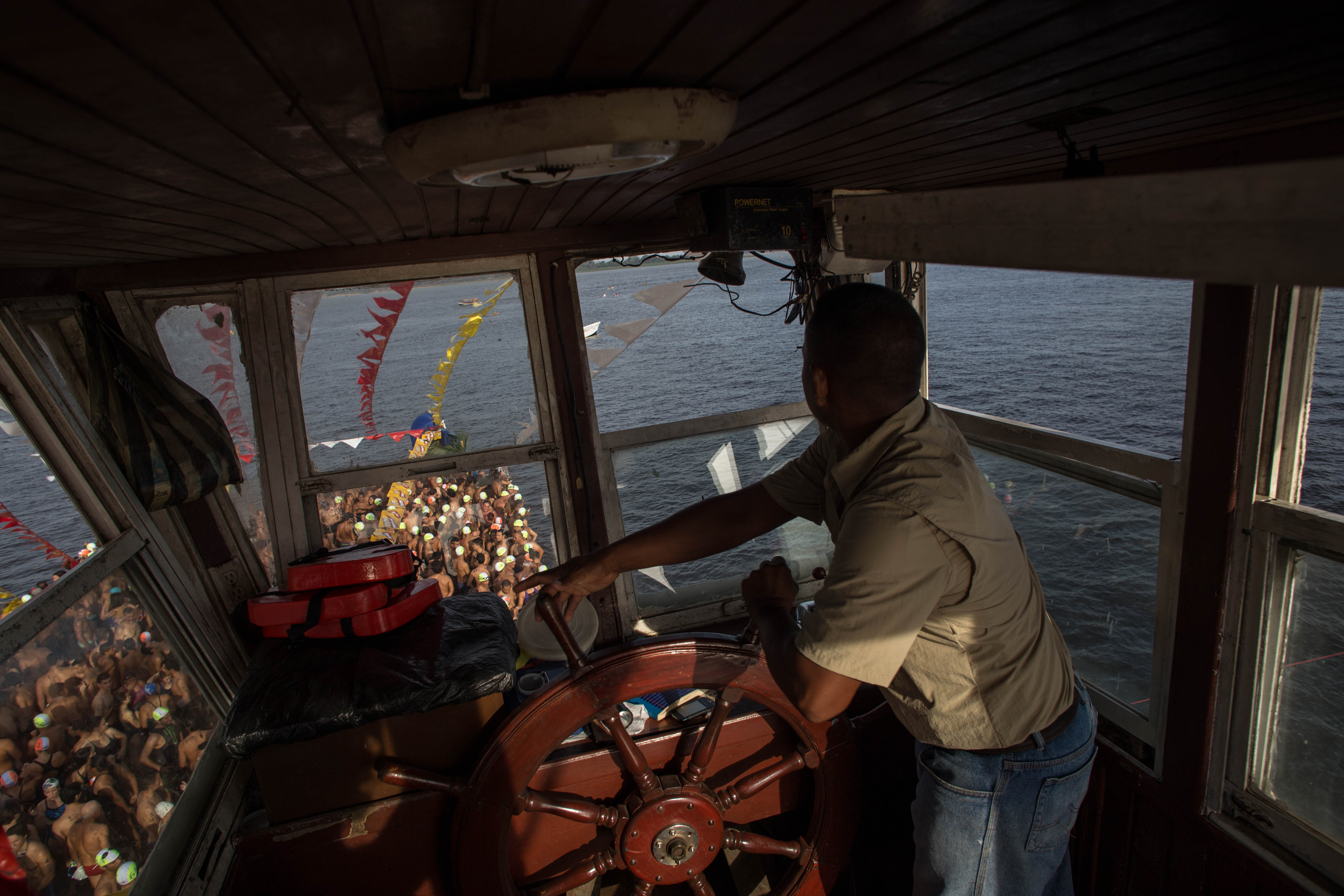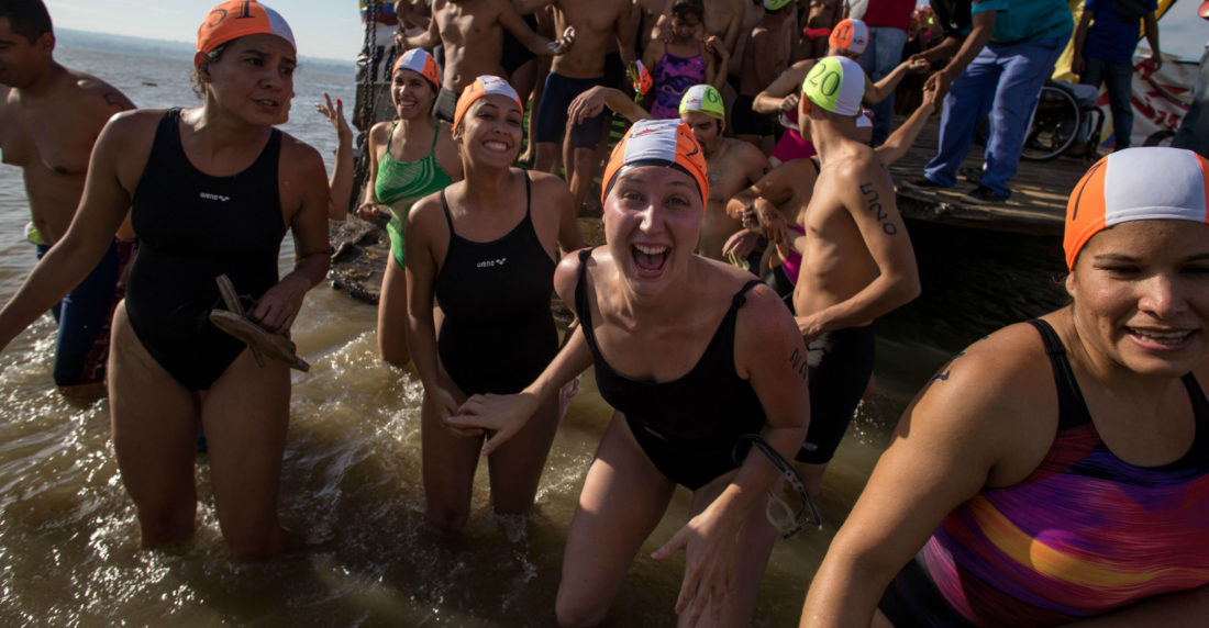 En eso volví a pensar cuando vi a Víctor Quintero ingresando al agua, tuvo que ser acompañado de la mano hasta la orilla. Él es un señor que ya camina un poco encorvado y a veces necesita de de ayuda para hacerlo. Desde sus 68 años cruza ambos ríos en cada edición anual. Este año, sin embargo, Víctor no pudo culminar. La corriente lo empujó por fuera de la ruta y una lancha debió trasladarlo hasta la orilla. Estando en tierra firme me confesó que no le importaba, que estaba contento porque ya lo ha hecho varias veces y porque este año pudo volver a intentarlo. Bajo una carpa de Instituto Nacional de Turismo (Inatur) y mientras nos tomaban una foto para propaganda del gobierno, me dijo que tenía un invento y se puso el cinto de seguridad de una botella de agua en el ojo: “Esto es para ver VTV y no quedarse dormido”.