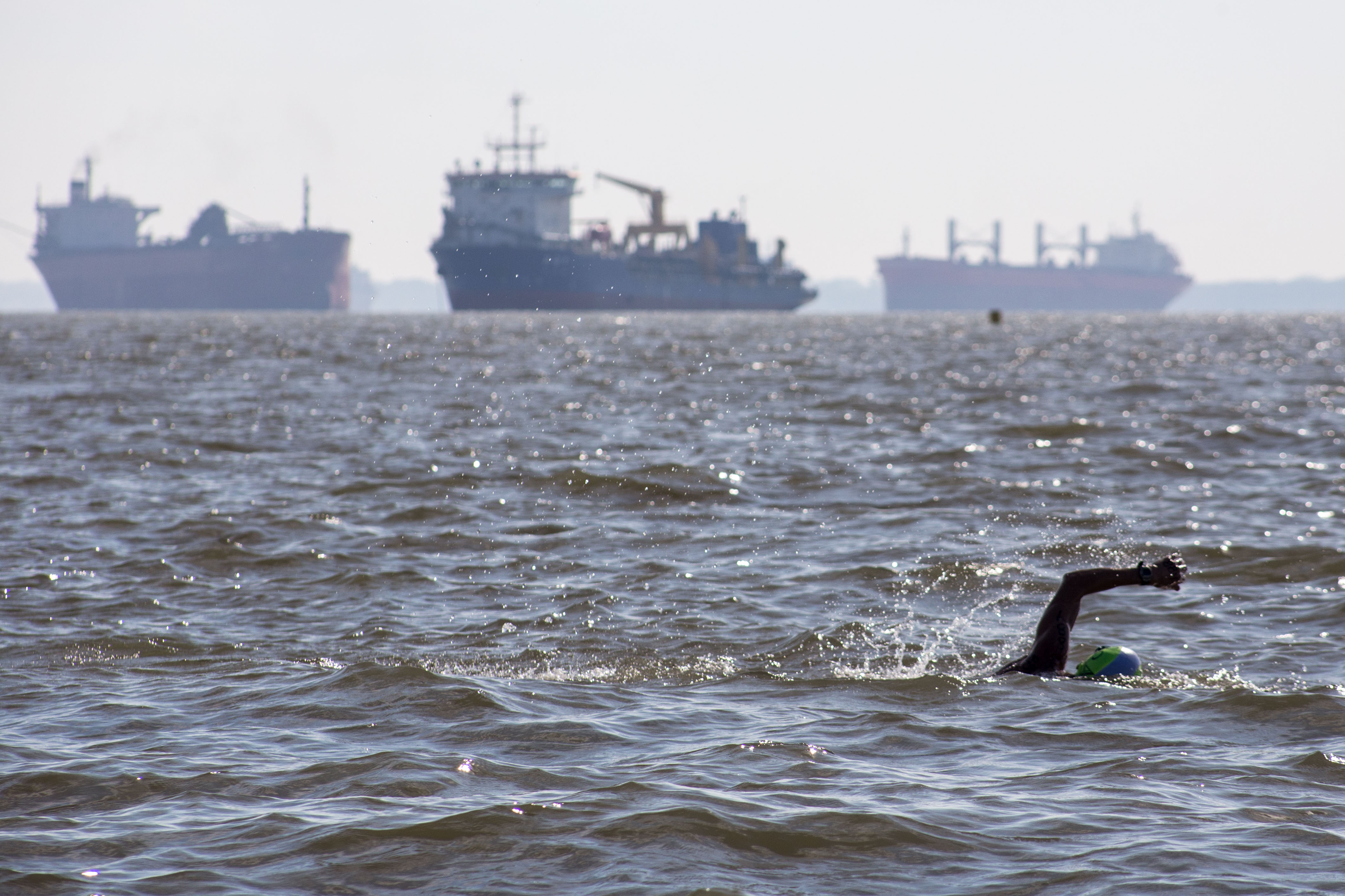 Al contrario de la percepción de otros nadadores, para mí la primera parte, la del Orinoco, fue la más difícil. En lo que comencé a nadar comprobé que el agua es totalmente arcillosa y no puedes ver ni siquiera tus manos. Entonces debí alzar la cabeza y seguir con brazada de Waterpolo, por encima siempre del agua. Eso me cansó muchísimo y me hizo pensar en quitarme el gorro, estirar el brazo y pedir auxilio de una lancha. Pero decidí que no podía ser tan “ñera” o pusilánime, que lo mejor era al menos llegar hasta el Islote Fajardo.