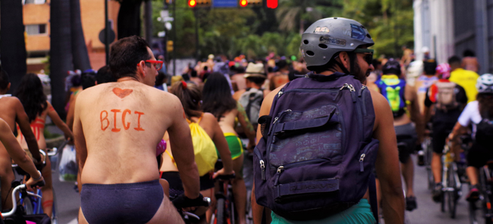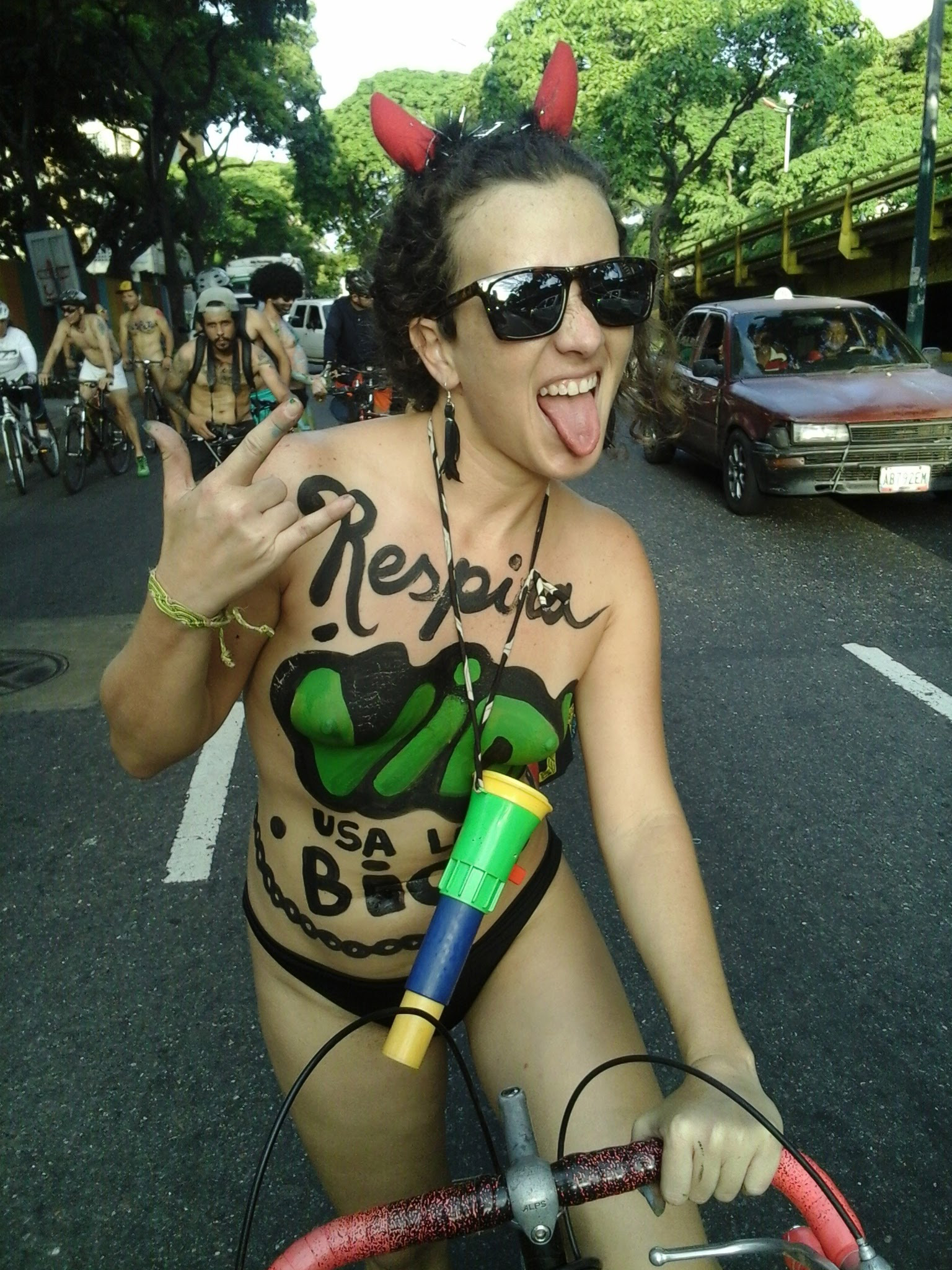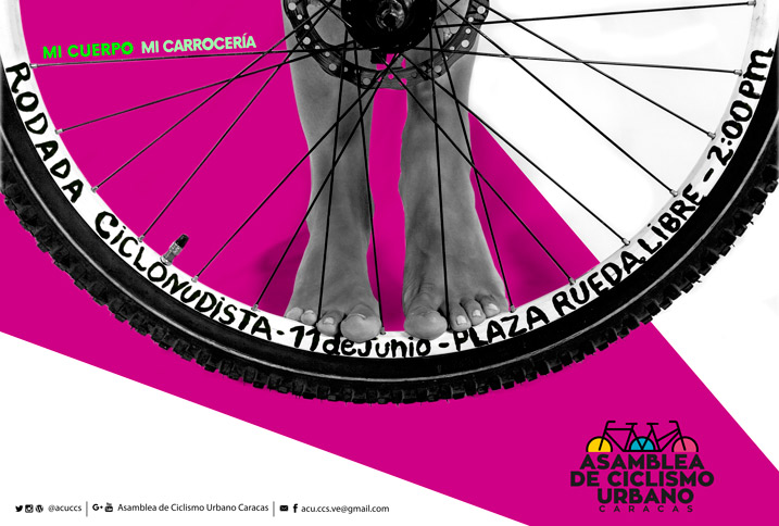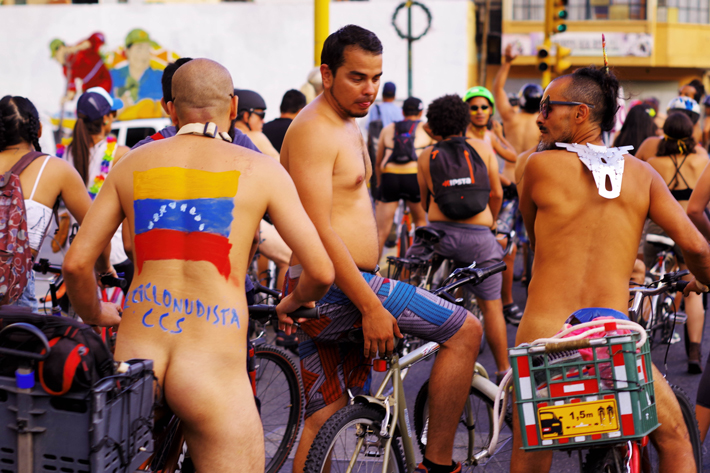 “Si la bicicleta es el vehículo, pues nuestro cuerpo es la carrocería. Nuestros derechos a coexistir con el resto de los vehículos como ciclistas urbanos cobra la forma del desnudo. El hecho del descuido y del atropello quedan vigentes en tan sólo una acción, no tan solo en las calles de las ciudades, sino en las carreteras. Cuando participé en la primera Ciclonudista no me desnudé completamente y después sí”, nos relata Néstor Delgado, ciclista urbano e integrante de la Asamblea de Ciclismo Urbano de Caracas.