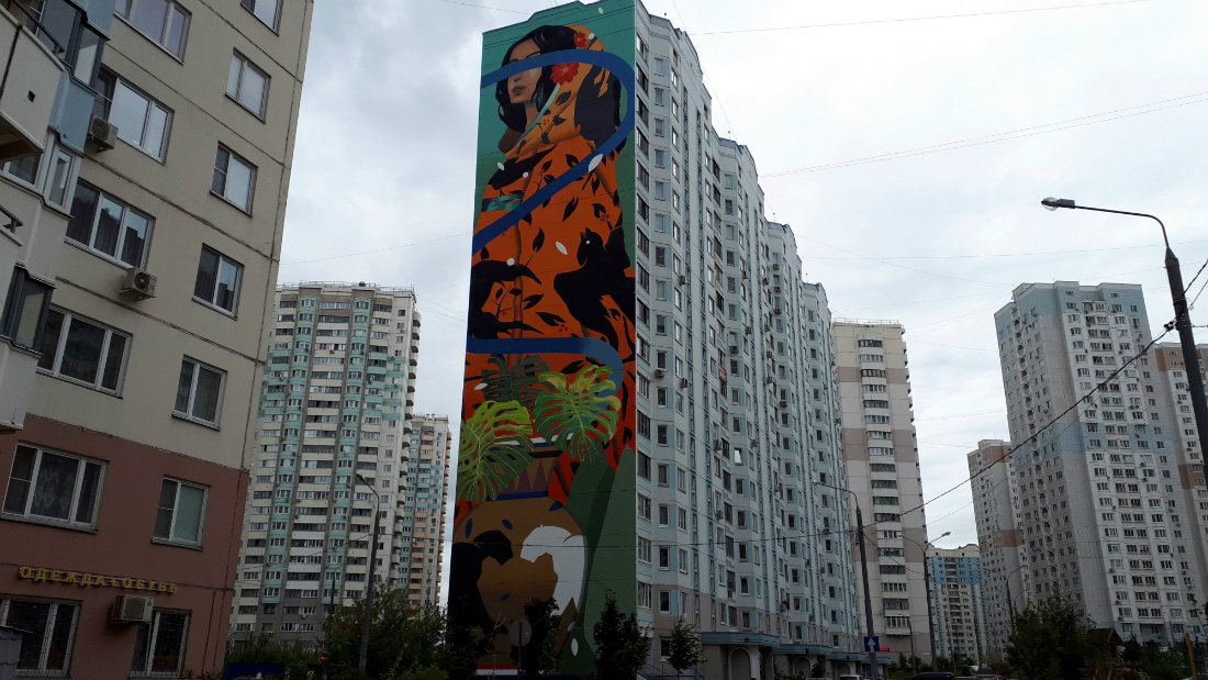 El mexicano Farid Rueda ya es veterano en eso de pintar murales en Moscú, a donde ha viajado en tres ocasiones. Trae una pintura viva que muestra criaturas precolombinas y frutas tropicales con una paleta de colores fresca y viva.