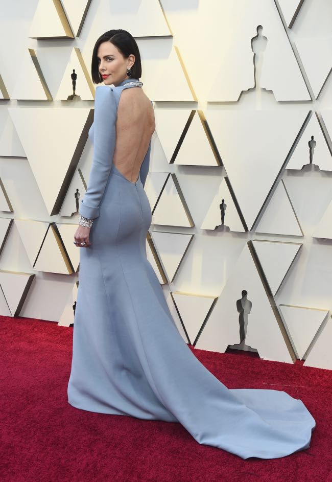 Charlize Theron cautivó con un vestido armado en azul celeste de Dior y por su corte de pelo en oscuro, e incluso recibió comparaciones por su parecido con la también actriz Isabella Rossellini.