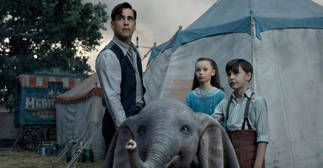 Mientras que el Dumbo original de 1941 tiene solo 64 minutos de duración, la versión 2019 dura casi dos horas, aquella caricatura de mediados de siglo tenía como foco principal los personajes animales, centrándose en Dumbo, la pérdida de su madre y su amistad con un ratón llamado Timothy. Esta versión híbrida CGI / live-action de Tim Burton tiene como foco la humanidad, Colin Farrell interpreta a Holt Farrier, un veterano de la Gran Guerra que regresa a su familia de circo estadounidense con un brazo menos. Su esposa murió en su ausencia, dejándolo a cargo de sus hijos Joe (Finley Hobbins) y Millie (Nico Parker) , quienes también viven en el Medici Bros. Circus, dirigido por Max. Medici (Danny DeVito).