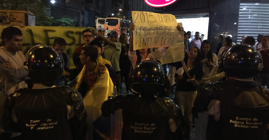 Los jóvenes, que gritaban consignas contra la inseguridad y la escasez, aprovechaban las luces rojas del semáforo para intentar desplegar sus pancartas con consignas, mientras que la policía no los dejaba salir de la acera. Minutos después un grupo -locales aseguran que no eran los manifestantes originales- procedió a trancar parte de la Avenida Arturo Uslar Pietri, lo que activó la acción de la policía, que dispersó con gases lacrimógenos.