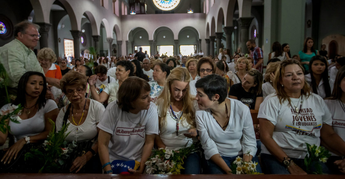 La esposas de los encarcelados Leopoldo López,Daniel Ceballos y Antonio Ledezma, comenzaron hoy una vigilia en la Iglesia La Chiquinquirá de La Florida para pedir por la salud de los opositores en huelga de hambre y por la mediación del papa Francisco en la crisis venezolana. "Esta es una vigilia por la paz y la unidad nacional, es una hora para el reencuentro de todos en familia para sacar adelante a nuestro país", dijo la esposa de Ledezma. La esposa de López, Lilian Tintori, que se sumó a la vigilia a la media noche del viernes, señaló que esperan "un gesto de paz, un gesto de humanidad" por parte del Ejecutivo venezolano y en favor de los huelguistas. López y el exalcalde de San Cristobal Daniel Ceballos -ambos en prisión-, comenzaron, el 24 y 22 de mayo respectivamente, una huelga de hambre para reclamar a las autoridades que se fije una fecha para las elecciones parlamentarias y que estas cuenten con la observación de la Organización de Estados Americanos (OEA) y la Unión Europea (UE). Asimismo, demandan que se libere a quienes la oposición considera son "presos políticos" y el cese de la "censura", y la "represión", que, aseguran, promueve el gobierno de Nicolás Maduro. Desde entonces otros tres opositores encarcelados y 25 personas más, según el partido de López, Voluntad Popular (VP), se han sumado al ayuno en las dos últimas semanas para respaldar las peticiones. La vigilia en la que participan las esposas de los políticos fue convocada por la opositora Mesa de la Unidad Democrática (MUD) en Caracas y se inició en la iglesia de la Chiquinquirá, lugar donde se encuentra más de una docena de los opositores en huelga de hambre. Está previsto que durante la jornada esta actividad se replique en las iglesias de las principales ciudades del país justo cuando el presidente venezolano viaja al Vaticano para reunirse con el Papa Francisco este domingo 7 de junio. "Todos esperamos que el diálogo que tendrán mañana el presidente Maduro y el papa Francisco traiga resultados satisfactorios para la paz de Venezuela, para lo cual es indispensable la libertad de los presos políticos", dijo al respecto la esposa de Ledezma. Los voceros de los partidos de oposición han responsabilizado al presidente venezolano y a la presidenta del Consejo Nacional Electoral (CNE), Tibisay Lucena -máxima autoridad electoral del país- de la salud de los huelguistas. Maduro que no ha hecho comentarios sobre los huelguistas, ha indicado que la fecha de las elecciones parlamentarias se fijarán cuando la autoridad electoral lo considere.