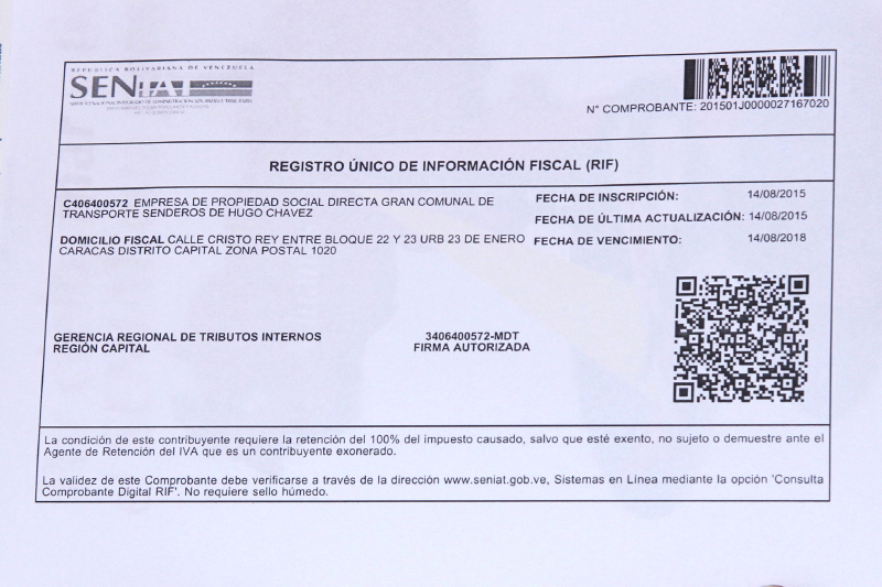 Los consejos comunales y comunas se inscribirán de ahora en adelante con la letra “C” dentro de la categoría alfabética que rige el Registro Único de Información Fiscal (RIF) del Servicio Nacional Integrado de Administración Aduanera y Tributaria (SENIAT). El sábado 15 de agosto se imprimió el primer documento fiscal de este tipo.