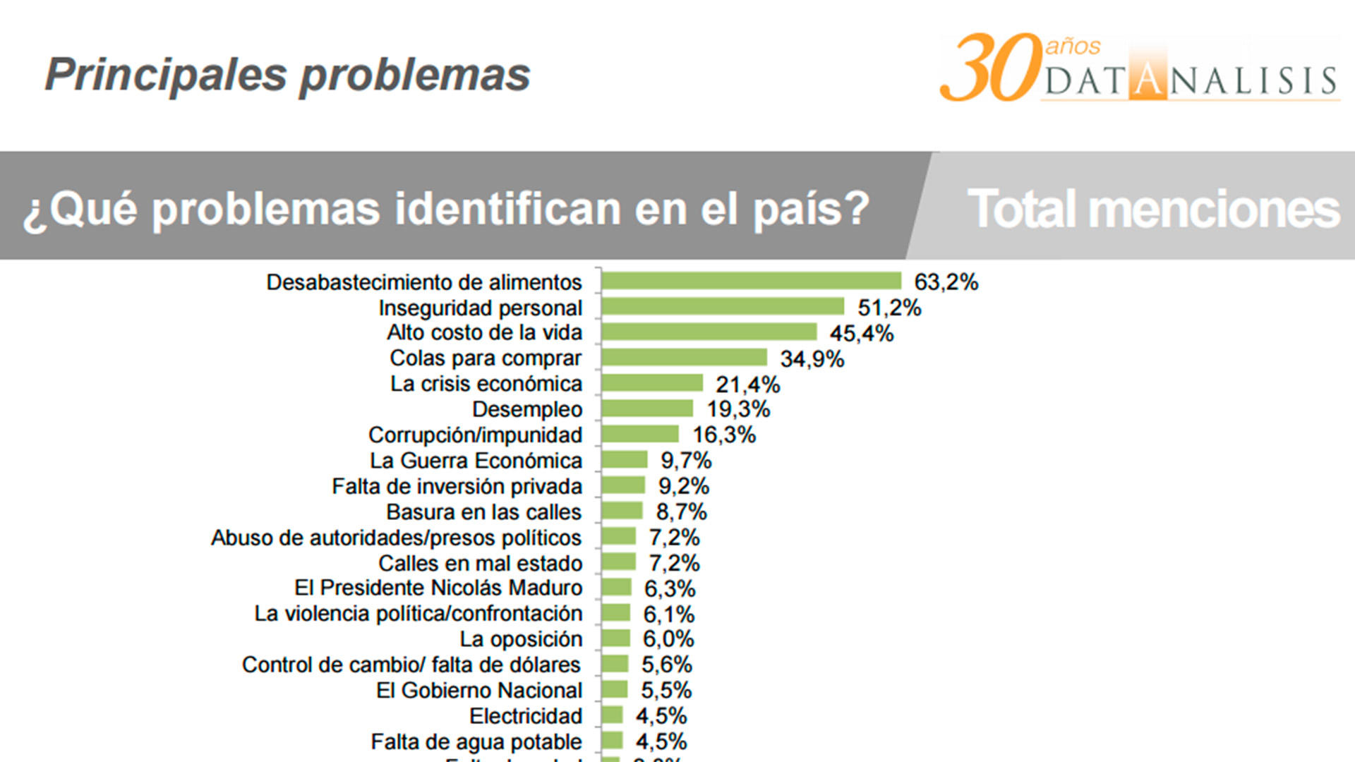 Una Encuesta Nacional Ómnibus, realizada por Datanálisis del 10 al 23 de julio de 2015, demuestra que el desabastecimiento de alimentos, la inseguridad personal y el alto costo de la vida ocupan los primeros lugares entre los problemas que identifica el venezolano hoy en día.