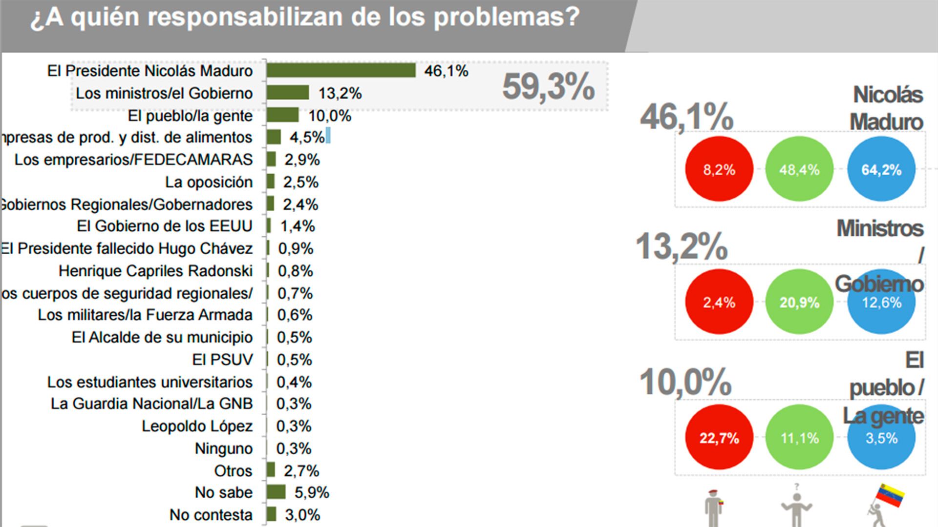 Entre los responsables de estos problemas, figuran en primer lugar el mandatario nacional Nicolás Maduro, seguido de los ministros de gobierno. También figuran los gobernadores y empresas de producción y distribución de alimentos.