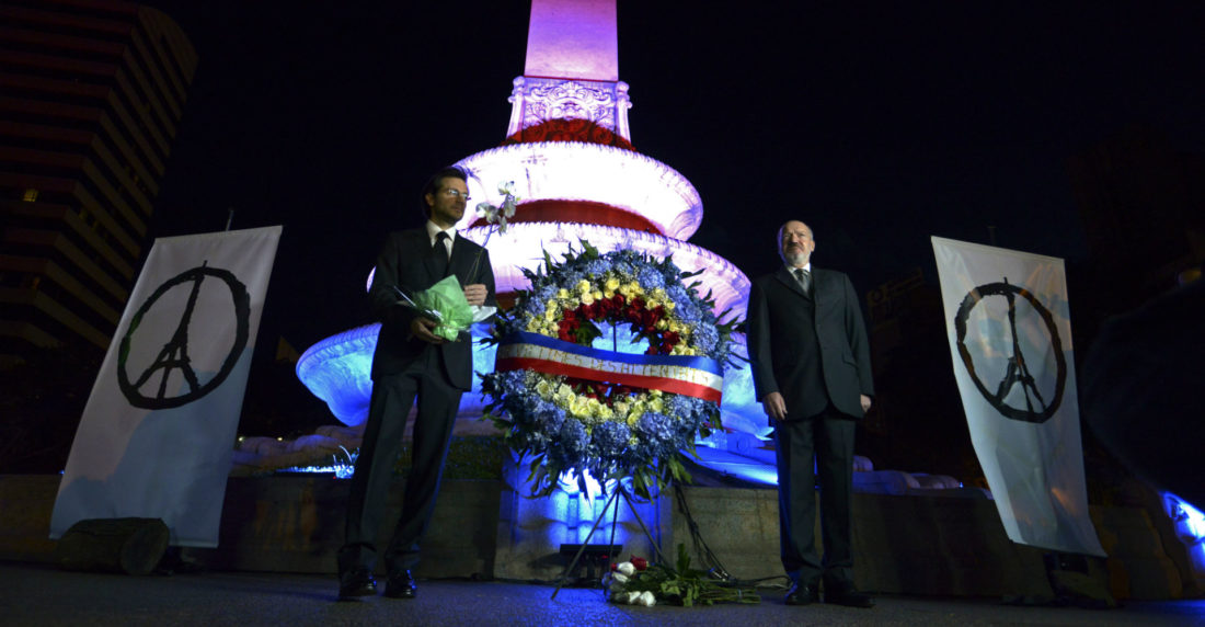 Durante el acto, el representante diplomático y las autoridades municipales guardaron un minuto de silencio, acompañados por más de un centenar de ciudadanos que se acercaron para poner flores blancas y encender velas a los pies del obelisco de la Plaza Francia, iluminado con los colores de la bandera del país europeo.