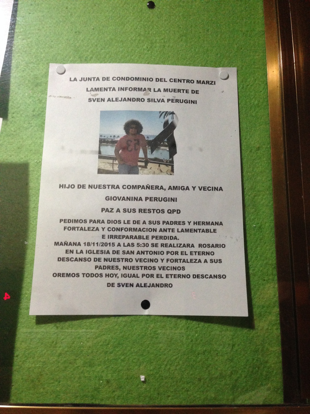 En el Centro Marzi, edificio donde creció Sven, lo recuerdan con cariño. «Lo conocí chiquito, lo vimos crecer y ahora nos enteramos de esta trágica noticia», cuenta Miguel un vecino de la familia desde hace más de 20 años. «Yo no sé ni que le voy a decir a mis vecinos cuando los vea. Cuando vi la noticia pude imaginar lo que siente Giovanina y Asdrubal. La pérdida de un hijo es lo peor que puede vivir una persona y más de una manera tan trágica como esta. Yo tengo un hijo que se fue a Chile y enseguida me sentí identificado», dijo el señor.