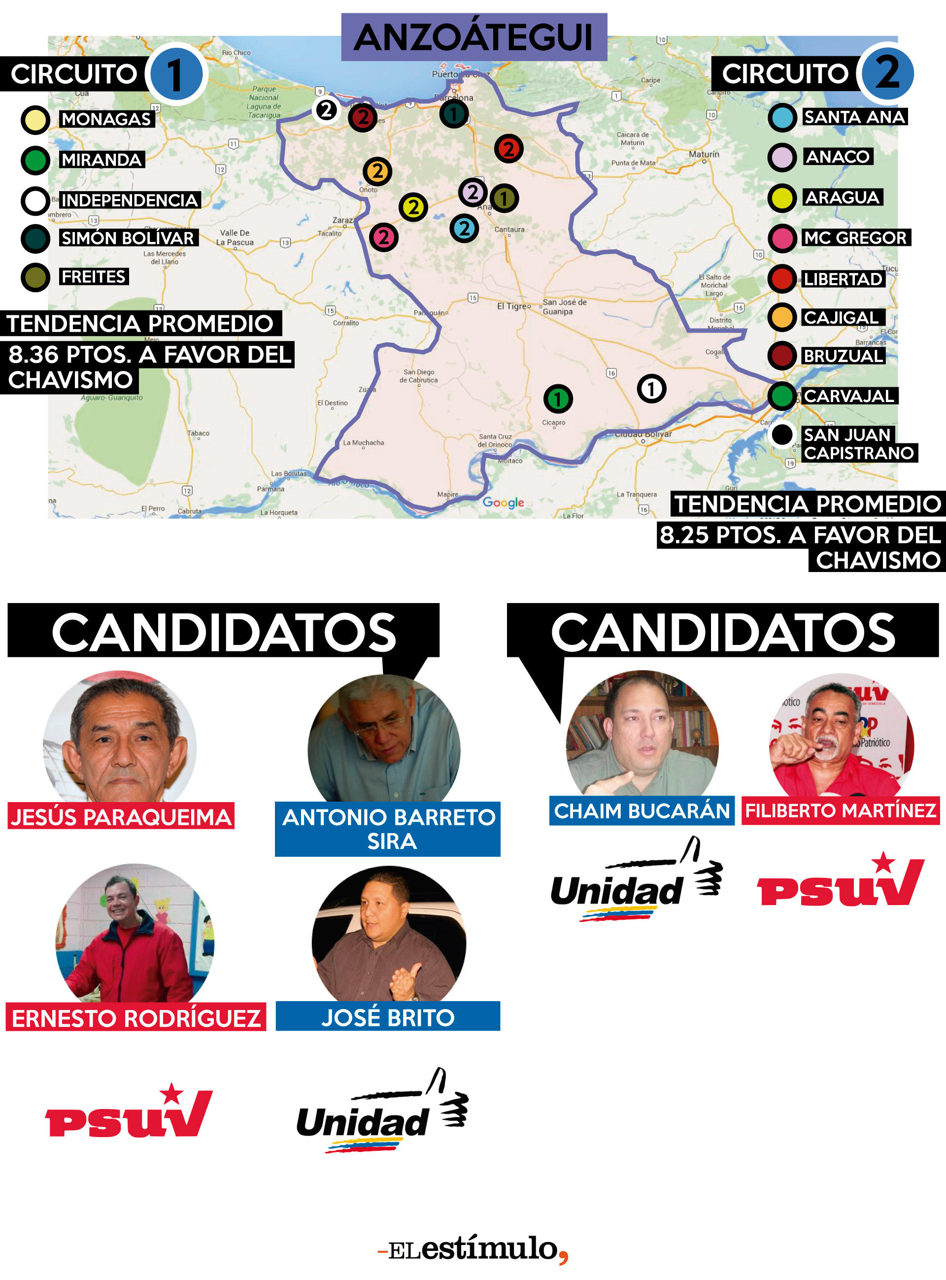 Si bien el circuito 2 de Anzoátegui es un territorio complicado, la MUD consiguió ganarlo por 1,31 puntos en 2010 y 0,87 puntos en las presidenciales de 2013. Aunque una encuesta de Datanálisis hecha en octubre mostró al candidato opositor con ventaja, el chavismo controla las 9 alcaldías que componen el circuito, por lo que parte con una fortaleza logística. Como la mayoría de los candidatos de Anzoátegui, Bucarán tiene a su favor que fue elegido en primarias, por lo que ha estado recorriendo su circuito desde antes de mayo.