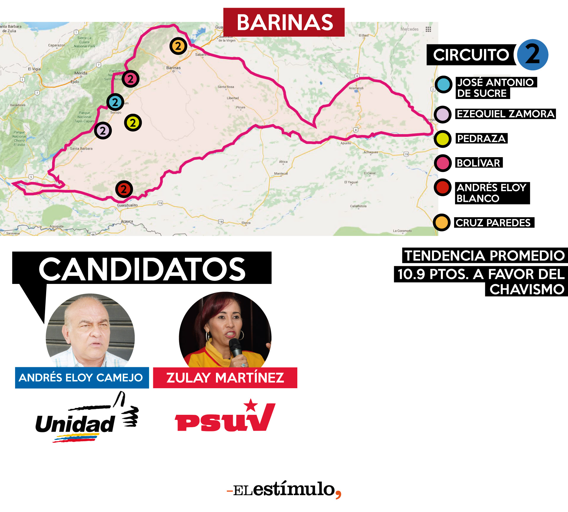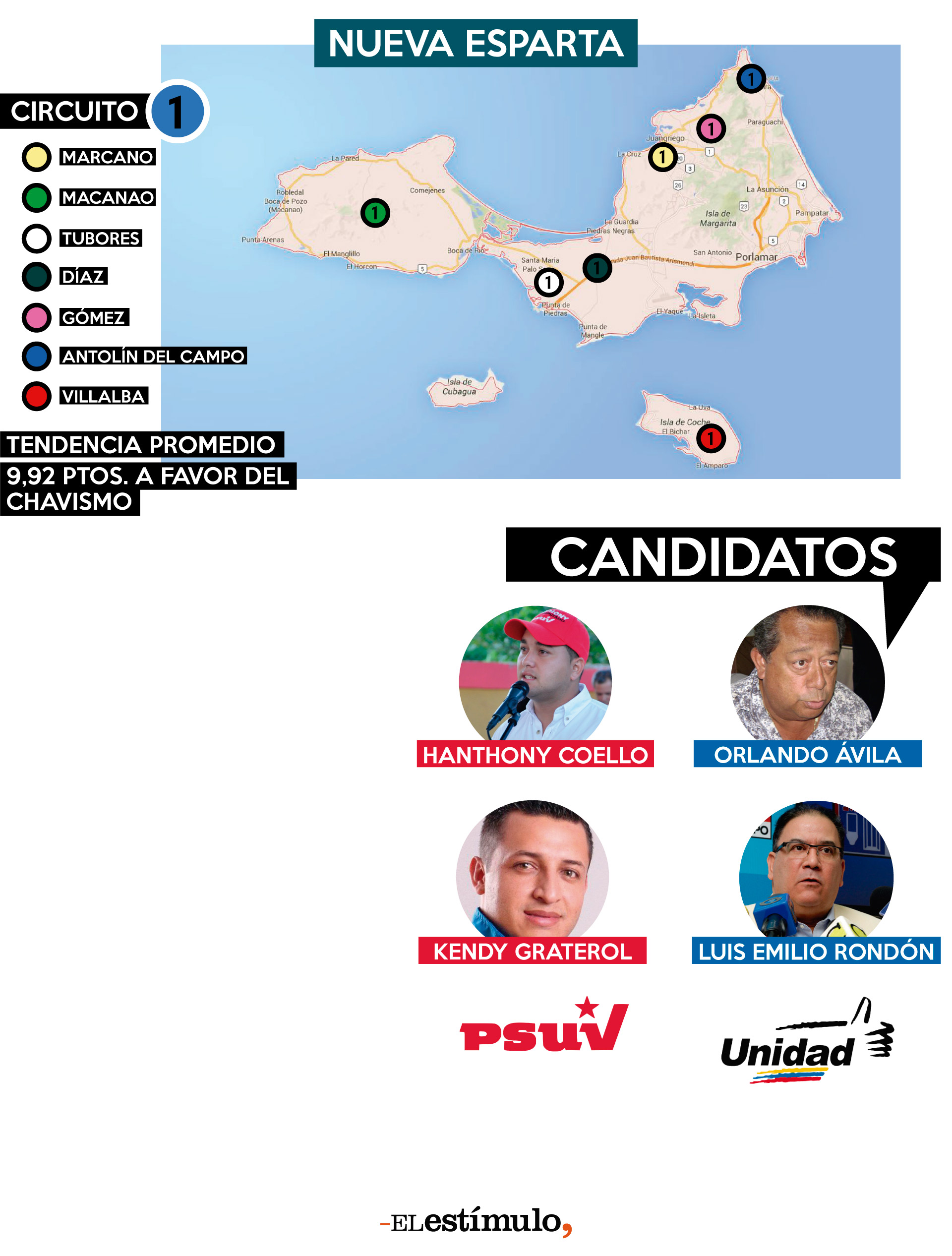 La MUD ganó este circuito en 2010, pero desde entonces no ha podido vencer nuevamente. Aunque una encuesta de Datanálisis de octubre indicó que los candidatos opositores estaban bien posicionados, existen dos factores que juegan en contra de ellos: 1) El PSUV tiene una ventaja logística por controlar la gobernación y 6 de las 7 alcaldías que integran la circunscripción y 2) la MUD va dividida luego de que Pastor Heydra, que quedó segundo en las primarias de mayo, se lanzó por separado con el MAS. El dirigente argumentó que la segunda candidatura deberían habérsela dado a él y no a Rondón, elegido por consenso.