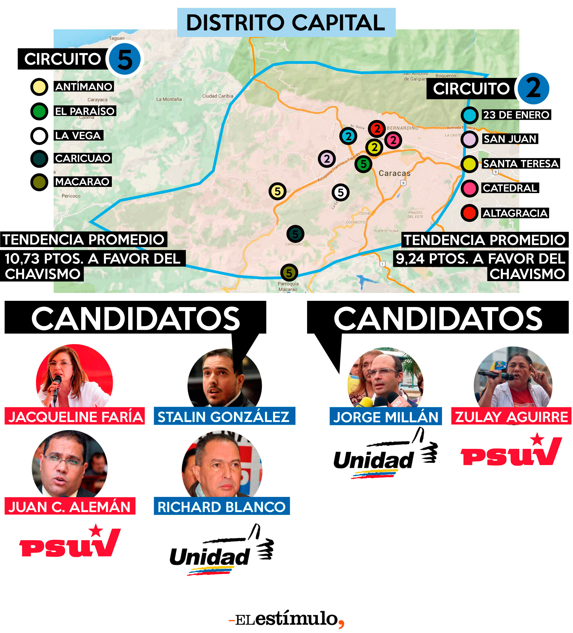 En 2010 la MUD perdió el circuito 2 por 2,72 puntos porcentuales, la ocasión que ha estado más cerca de una victoria en este territorio. Su principal debilidad actualmente es lo poco conocido que es su candidato, un concejal del municipio Libertador que ha hecho la mayor parte de su carrera política en otros espacios de esa jurisdicción.