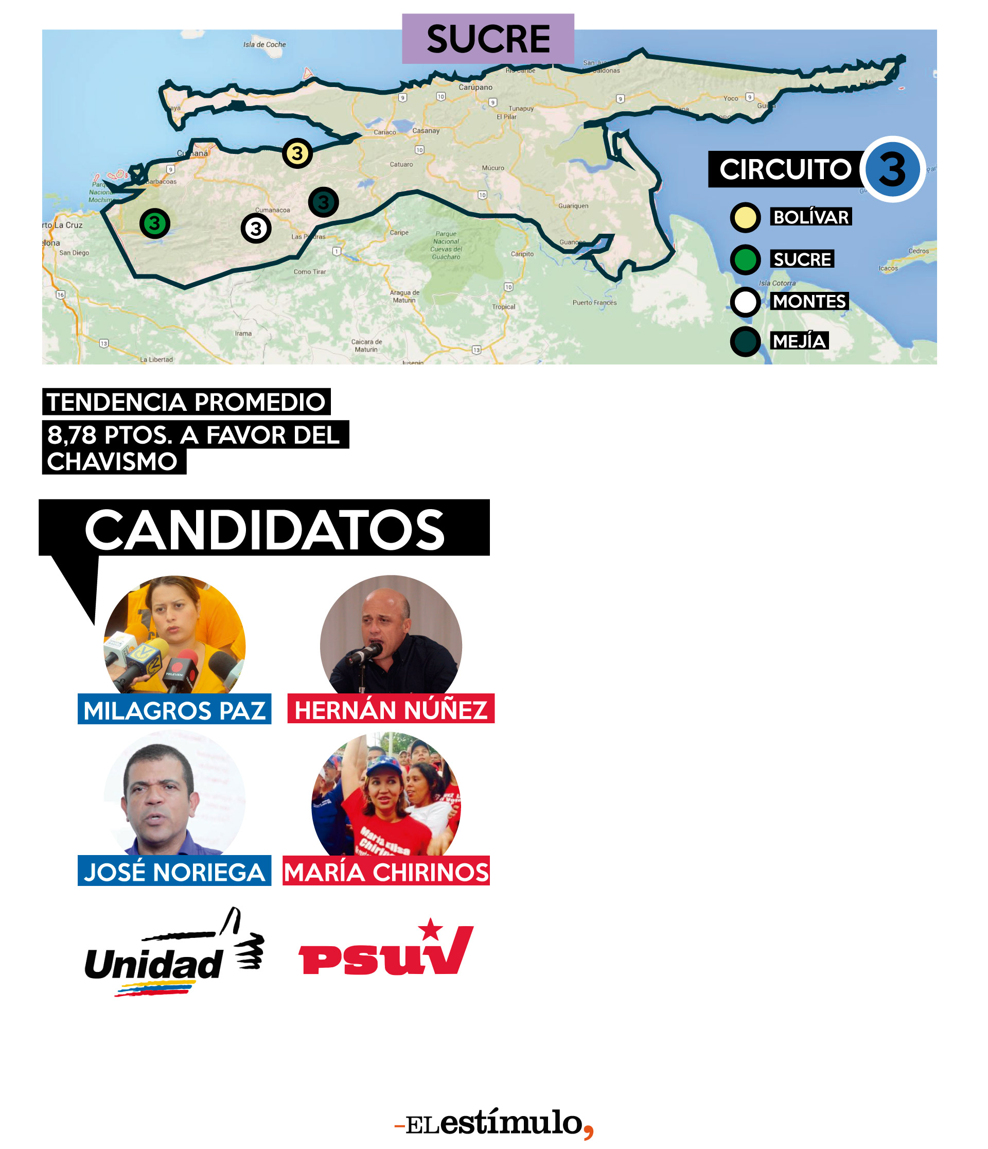 Luego de ganar este circuito de manera clara en 2010, la MUD no ha podido triunfar nuevamente en este lugar a medida que la influencia que tenía Podemos en este estado se ha ido disipando. La oposición compite ahora contra el candidato con el que ganó en las pasadas parlamentarias, Hernán Núñez, quien se pasó a la filas del chavismo a finales de 2012. La MUD ha cambiado tanto en este estado que unas primarias para seleccionar candidatos podrían haber funcionado mejor que elegir por consenso, como al final se hizo.