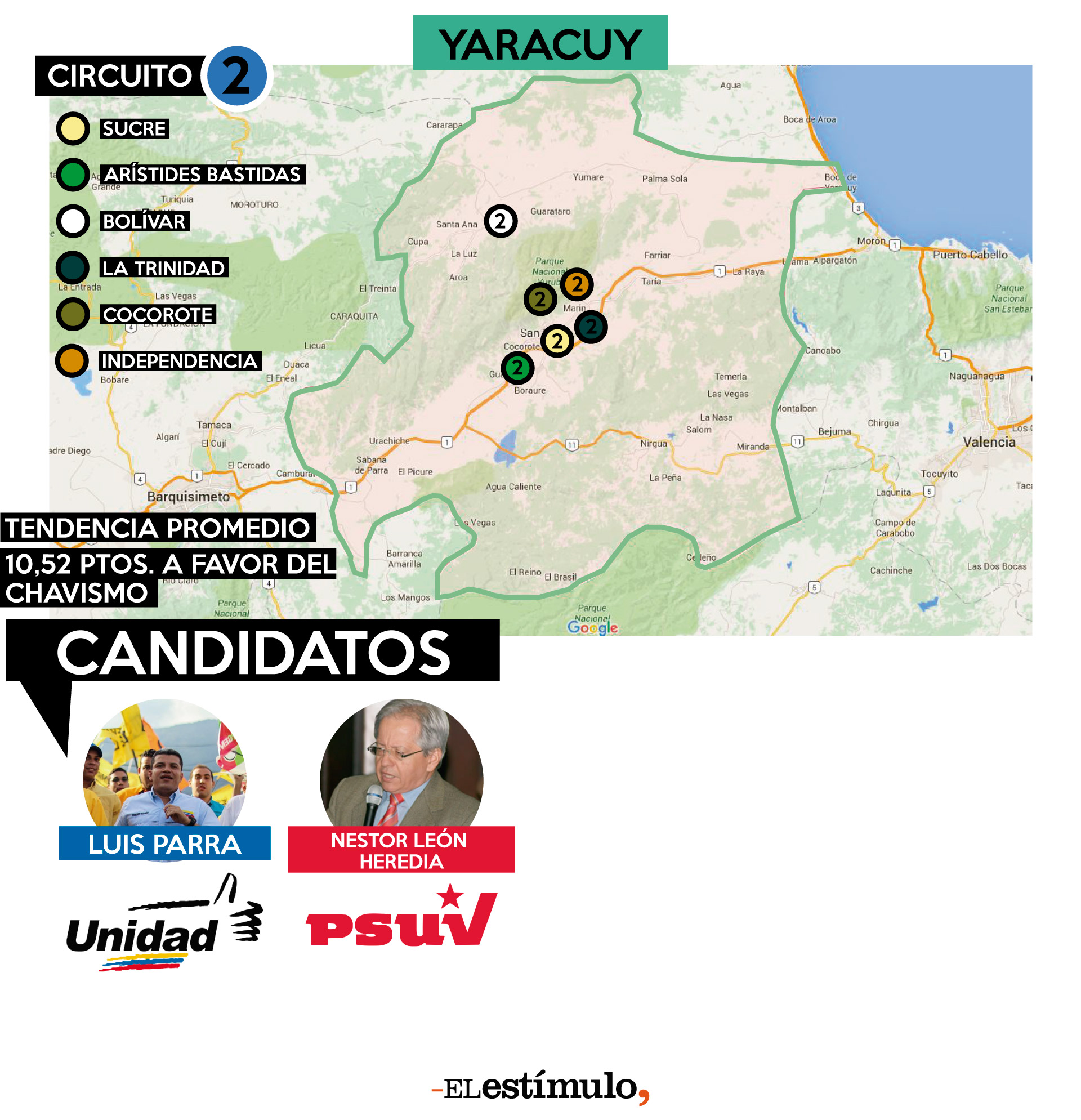 Yaracuy es un estado controlado por los hermanos León Heredia: Julio es el gobernador y Néstor es el candidato en este circuito, lo que da una ventaja logística importante al chavismo, que además controla todas las alcaldías. Pese a una realidad similar, en las presidenciales de 2013 Capriles apenas perdió este espacio por 1,09 puntos, por lo que la MUD tiene algunas opciones si se considera el gran descontento que hay por culpa de la crisis económica.