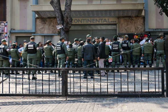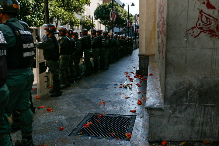 La Guardia Nacional Bolivariana pedía a los periodistas que iban a ingresar al Parlamento por la esquina de San Francisco a ingresar rápido porque el grupo «iba a lanzar más tomates».