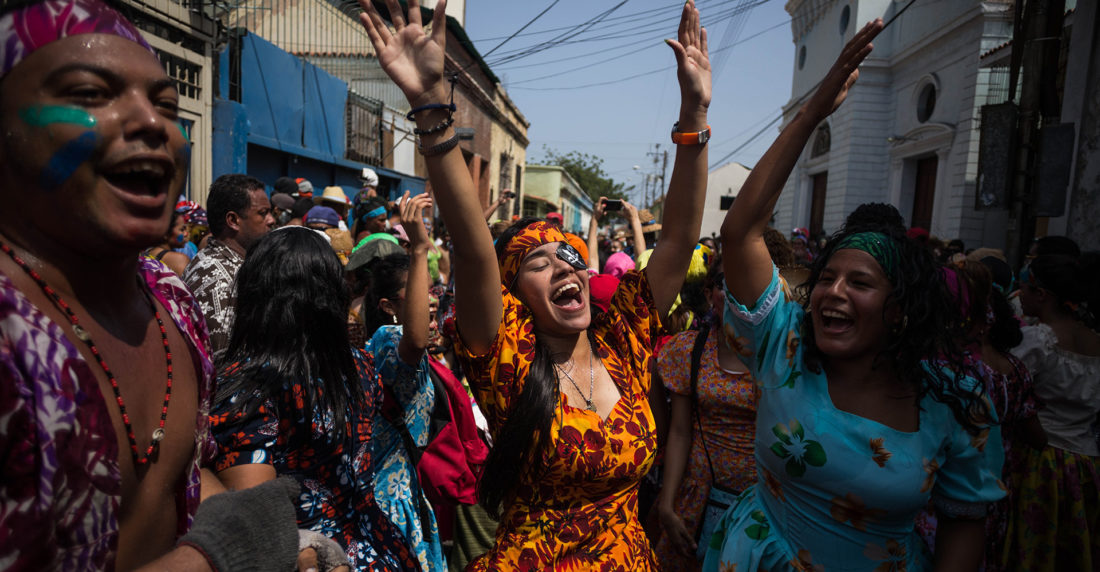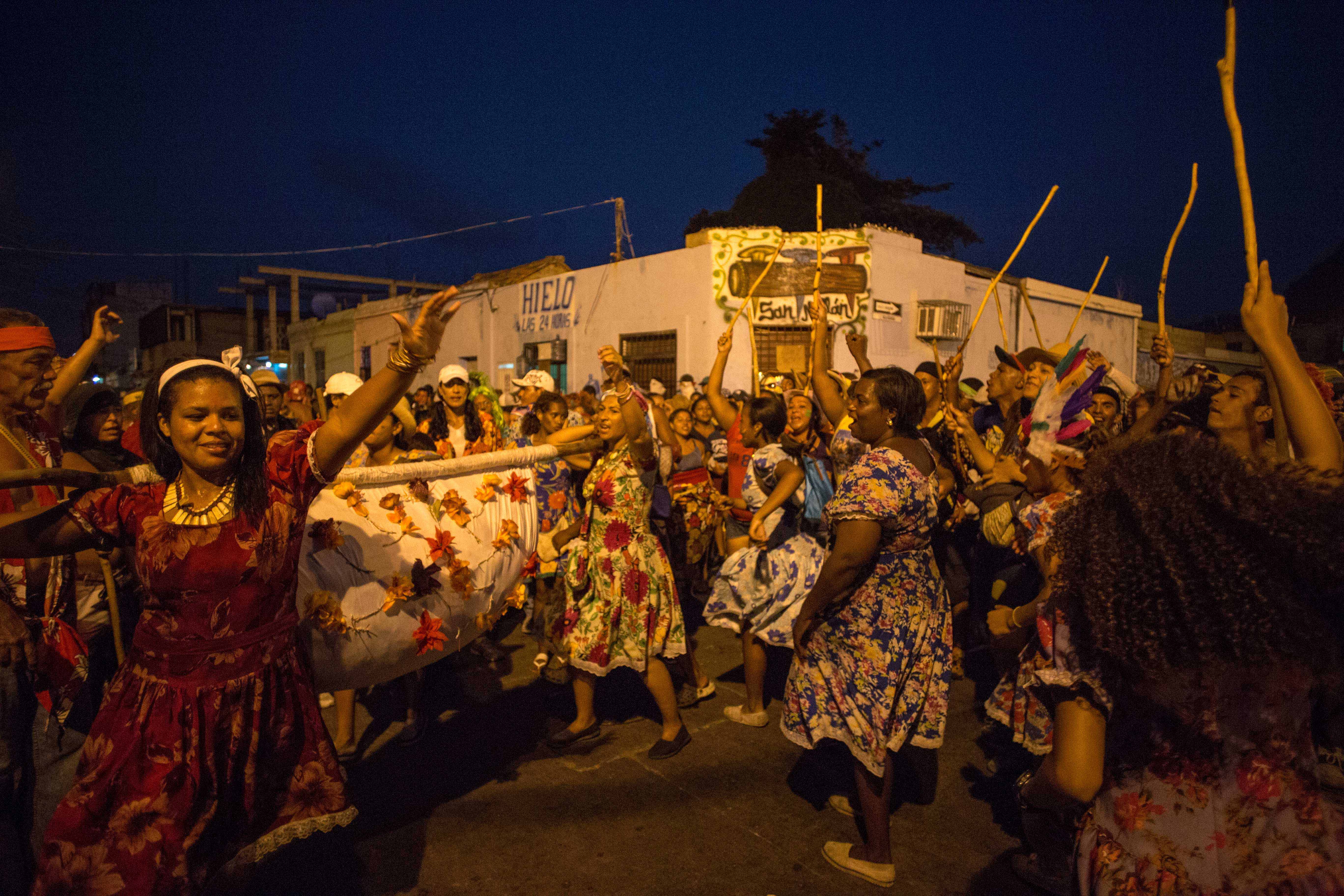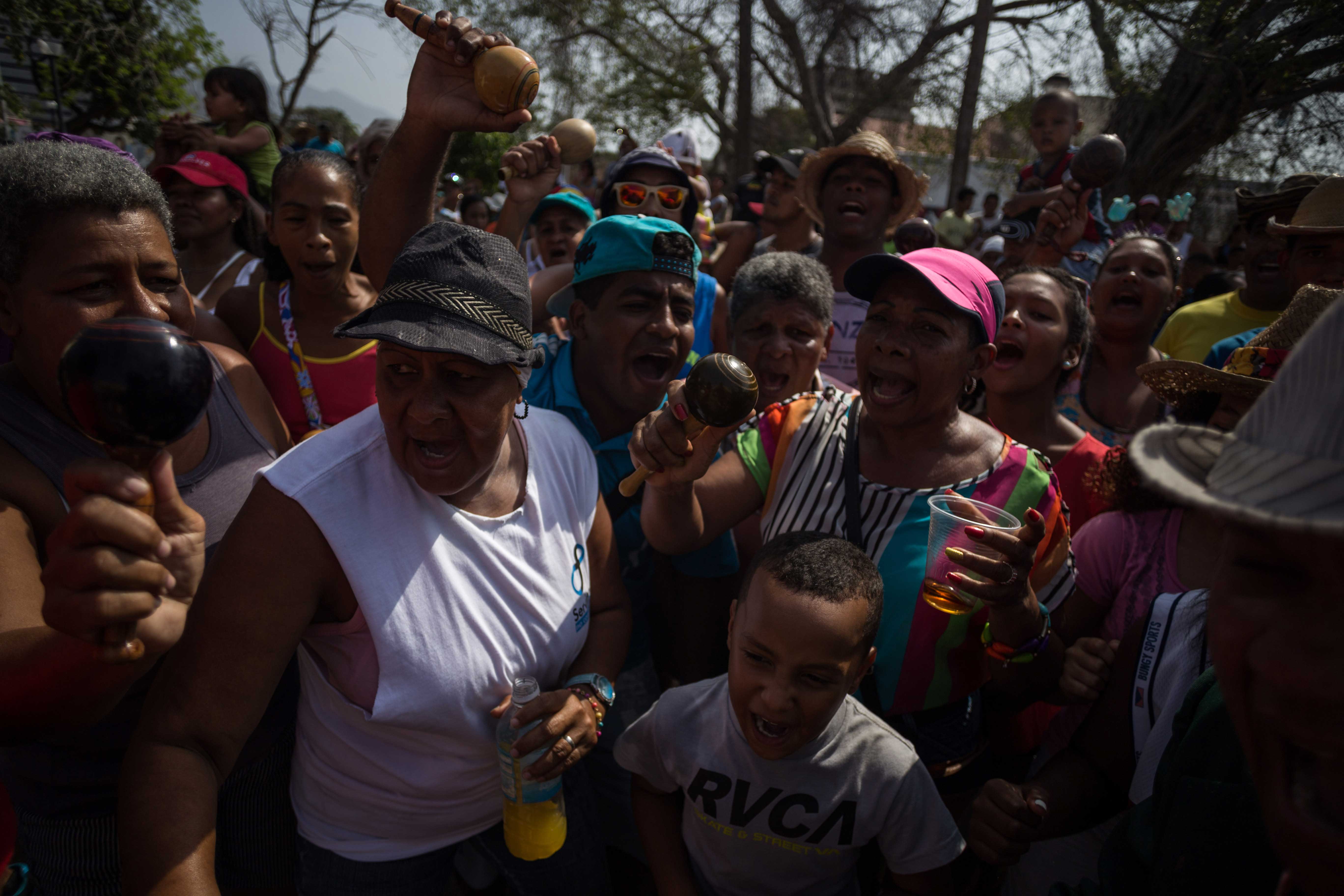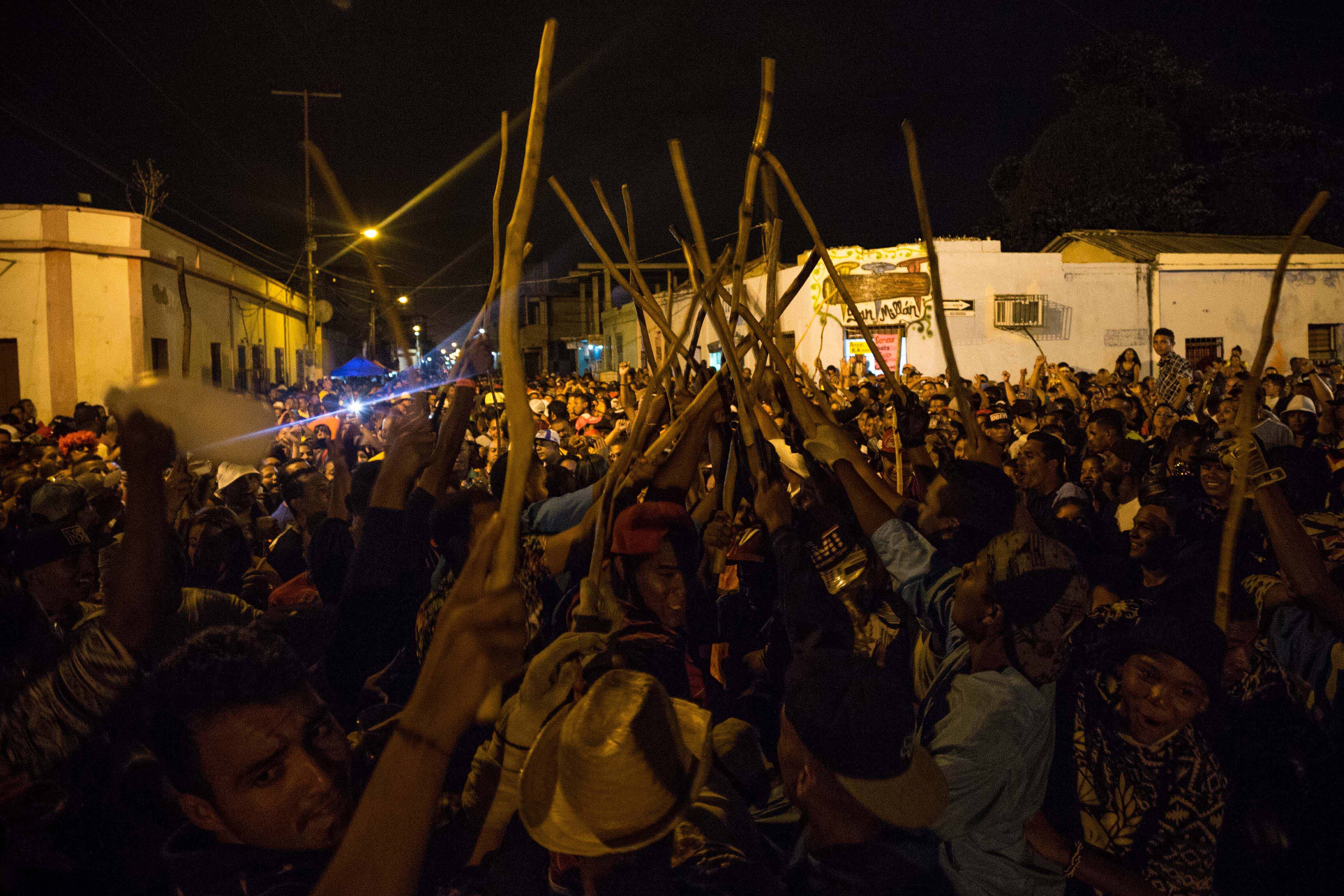 “Uno pelea por su mujer”, dice Rainer Martínez (36), quien bebe cocuy con los demás hamaqueros mientras llega la media noche. También saluda a los niños pequeños que le recuerdan cuando aprendió a pelear con vera a los 10 años. Dice que quienes se visten de flores son héroes, y son reconocidos por todos los que participan en la fiesta, en especial las mujeres, que los valoran por su destreza al luchar y luego se le acercan para ofrecerles caña y conversar.