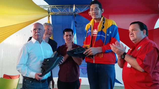 El veinteañero Jeison Rodríguez recibió sus nuevos zapatos de la mano del ministro del Poder Popular para la Juventud y el Deporte, Mervin Maldonado. Una donación de cuatro pares de zapatos fue el motivo de este acto para el hombre con el pie más grande del mundo, un venezolano que trabaja en el Instituto Nacional de Transporte Terrestre y estudia para sacar el bachillerato en la Misión Ribas.